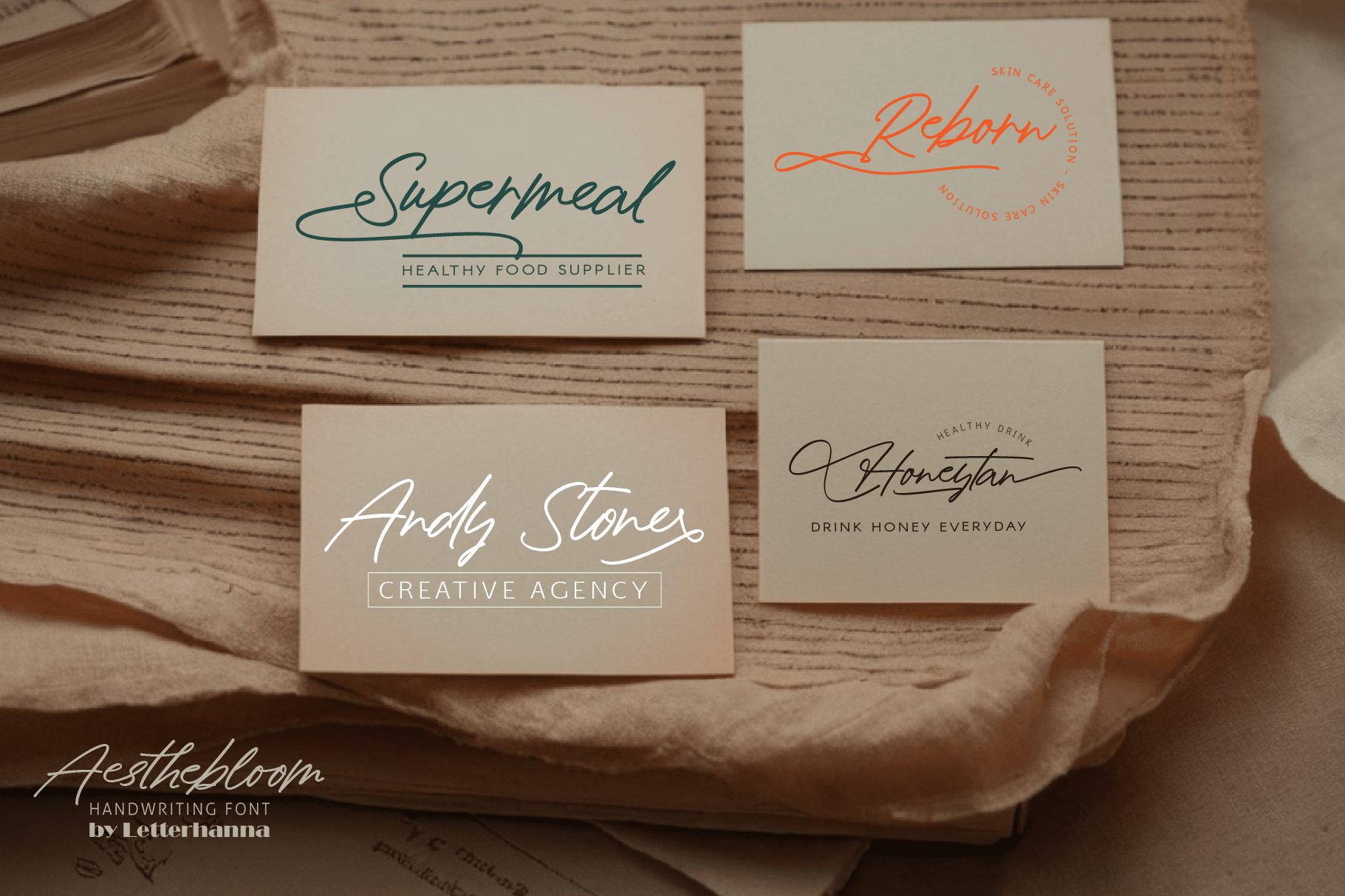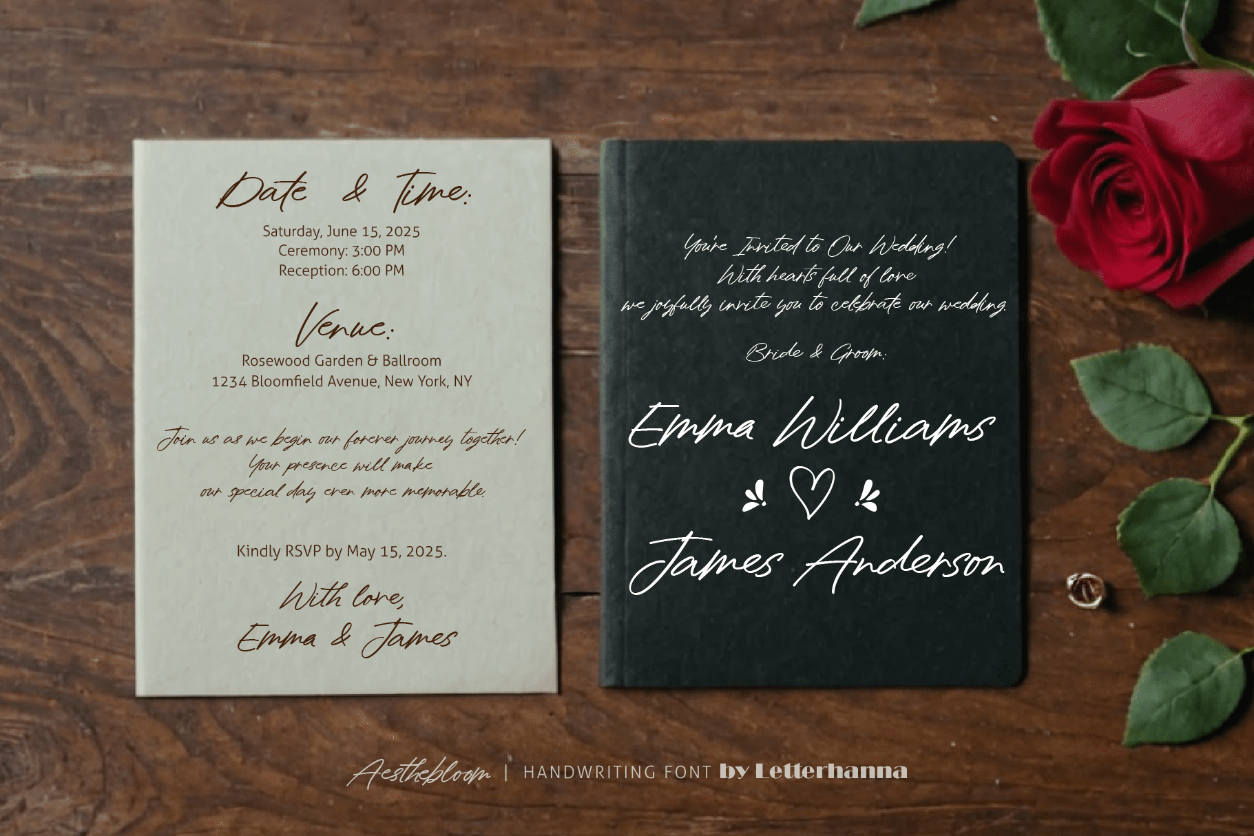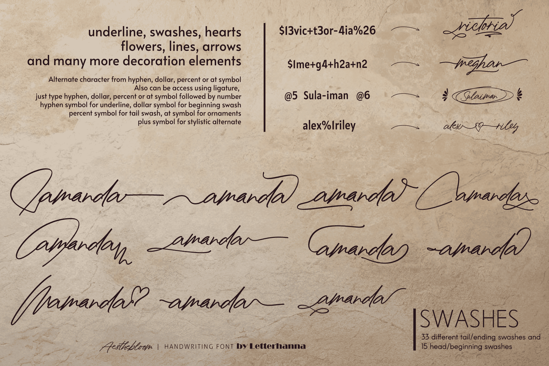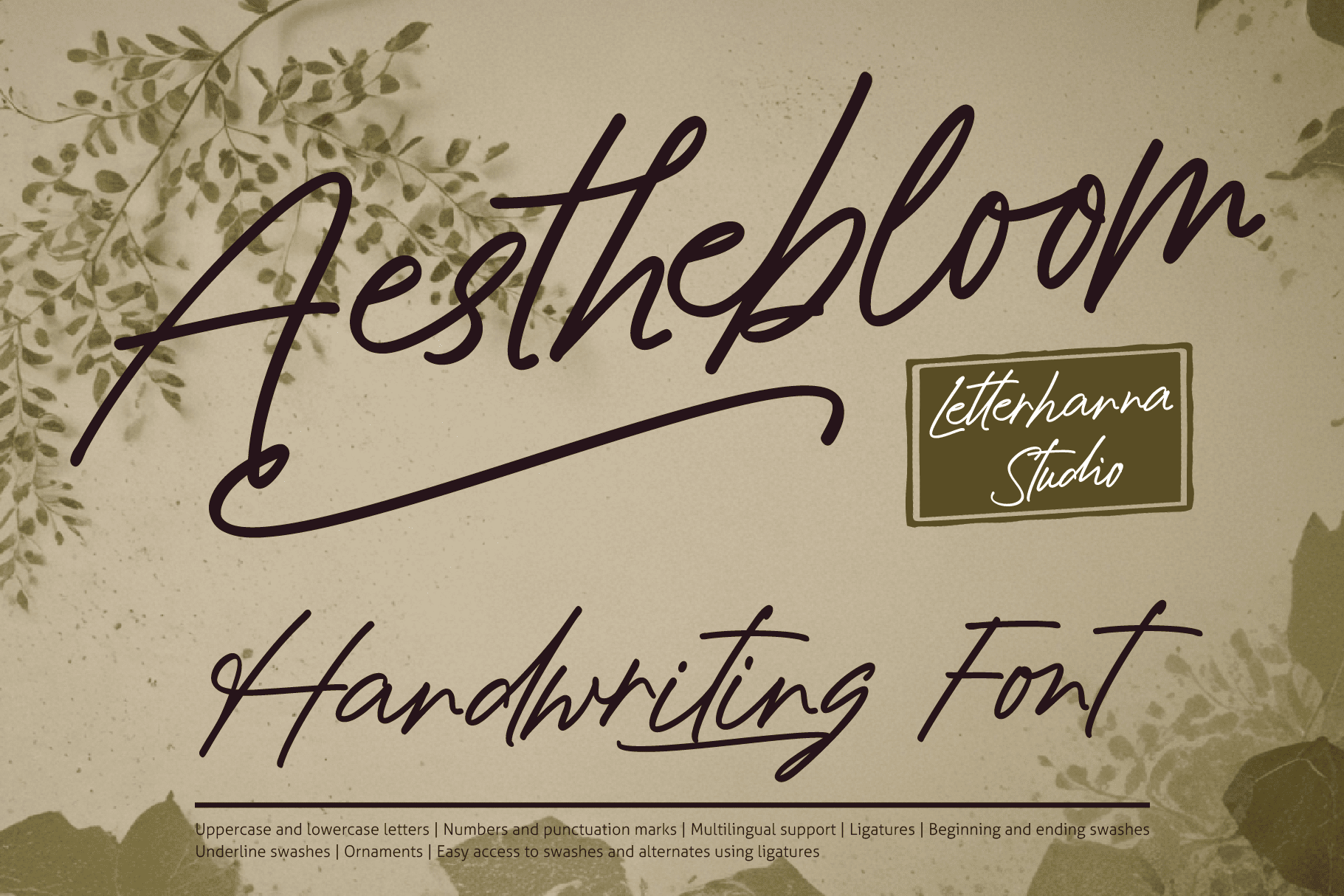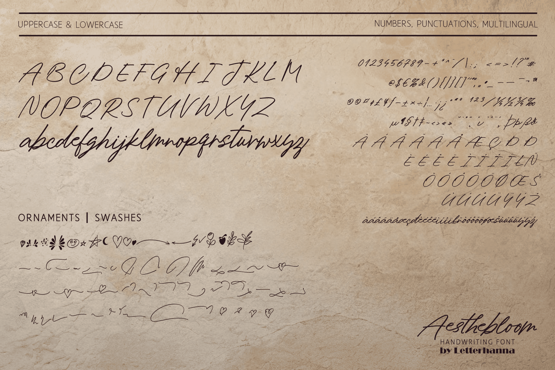 Introducing Aesthebloom Handwriting Font, a beautifully crafted script font that embodies elegance and artistic charm. Designed with a natural, flowing style, Aesthebloom captures the essence of hand-drawn lettering with smooth curves and graceful strokes. Perfect for branding, wedding invitations, social media graphics, and creative projects, this font brings warmth and sophistication to any design.