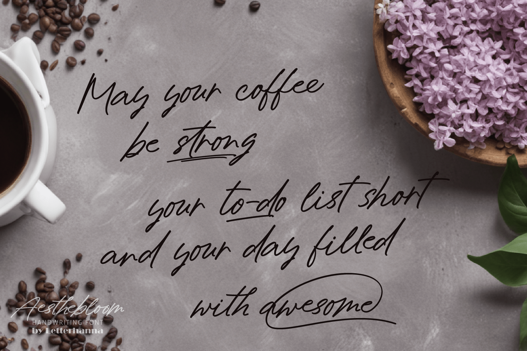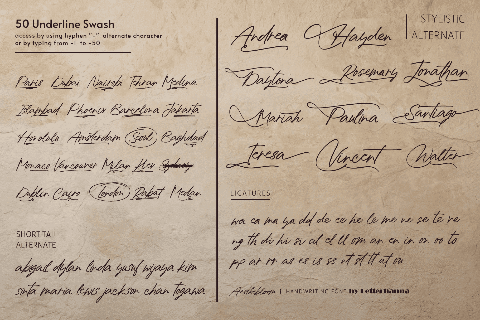 Aesthebloom Handwriting Font offers an extensive collection of stylistic alternates, swashes, and ligatures, allowing you to personalize your text with unique and expressive details. Whether you’re looking for a modern chic vibe or a timeless calligraphic touch, this font adapts effortlessly to your creative vision. Elevate your typography with Aesthebloom and make every word a work of art.