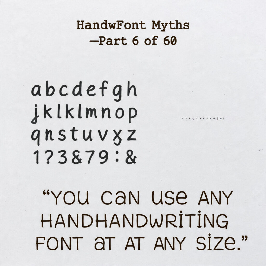 Handwriting fonts are particularly vulnerable to size-related degradation for several reasons that compound the general problem.