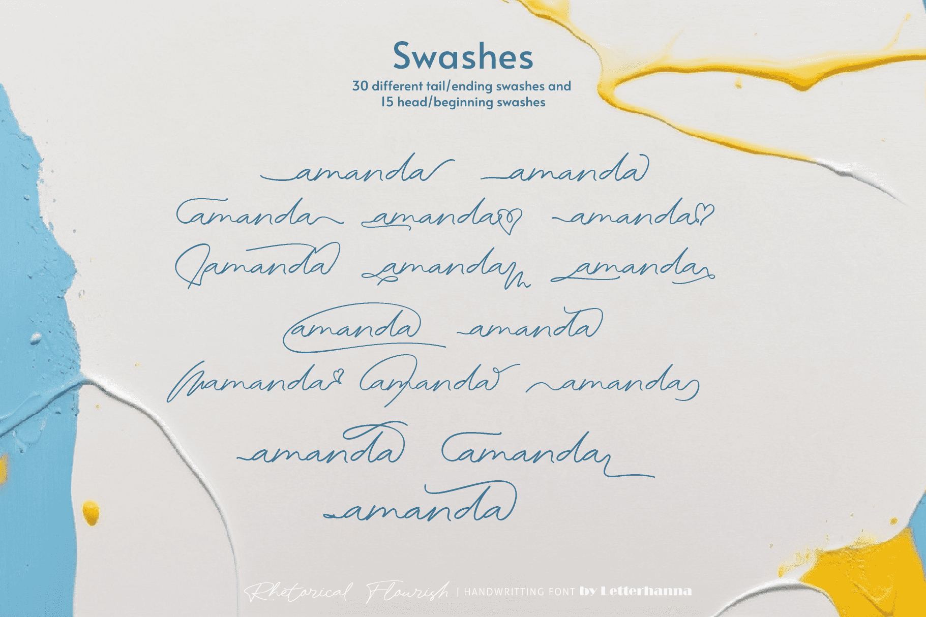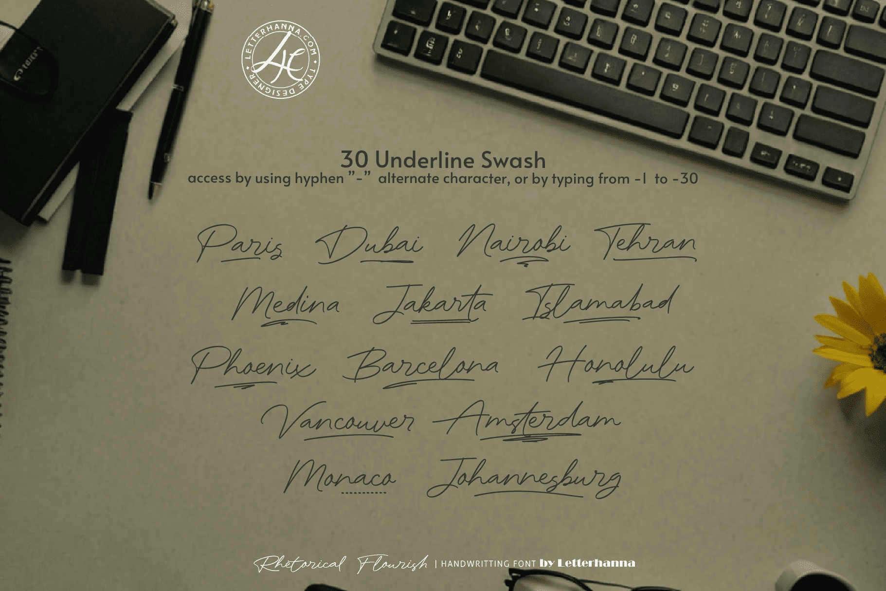 Gain easy access to all alternate glyphs, swashes, ornaments, and underlines by simply using ligatures. You can try them out yourself in the font preview tool on our website, letterhanna.com.