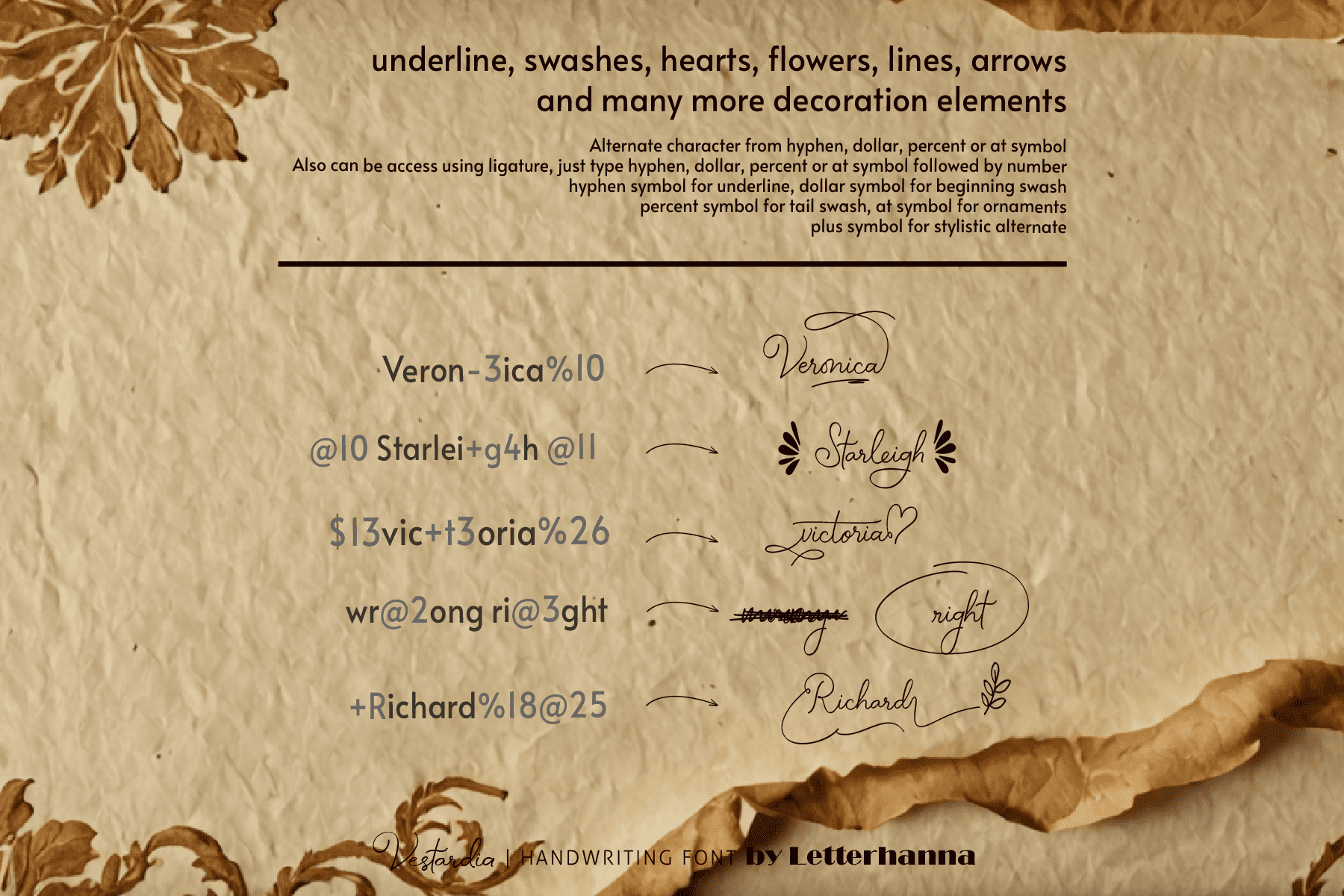 Gain easy access to all alternate glyphs, swashes, ornaments, and underlines by simply using ligatures. You can try them out yourself in the font preview tool on our website, letterhanna.com.