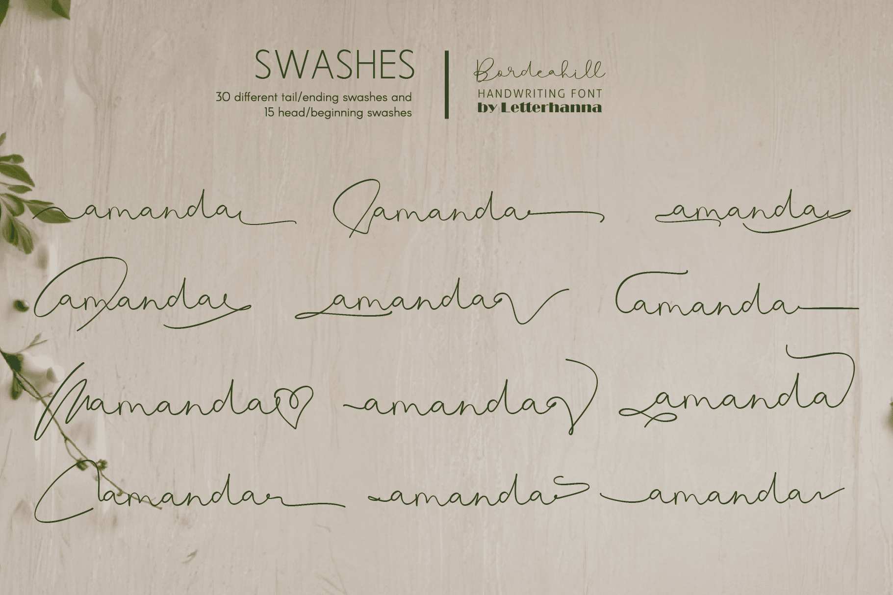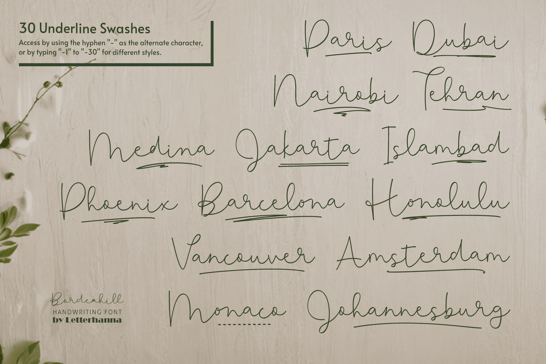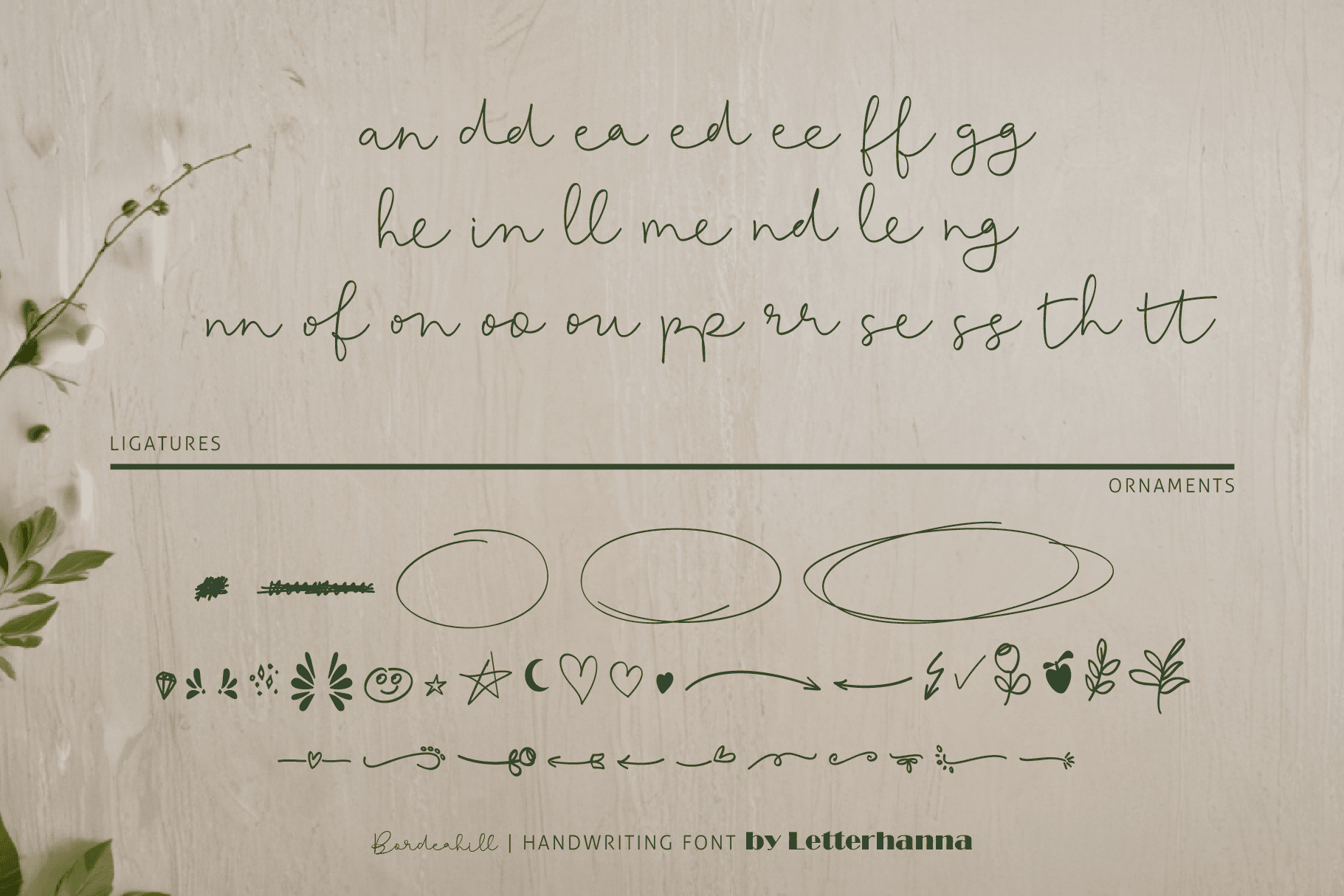 Gain easy access to all alternate glyphs, swashes, ornaments, and underlines by simply using ligatures. You can try them out yourself in the font preview tool on our website, letterhanna.com.