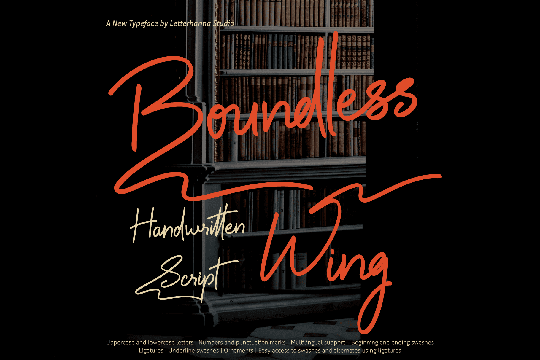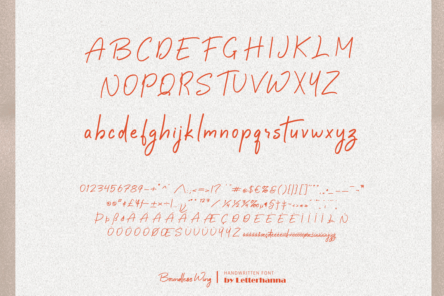 In a world of typed perfection, true emotion hides in the imperfect stroke of a pen. Boundless Wing captures that raw, bold energy. Crafted by Letterhanna Studio, this handwritten script font features abundant ligatures for seamless connections, beginning/ending swashes that frame your text dramatically, and a library of stylistic alternates plus ornaments for endless customization. It’s designed to feel handwritten yet remain strikingly readable—ideal for bold headlines, social media graphics, or editorial designs. Break free from ordinary typography. Discover Boundless Wing now