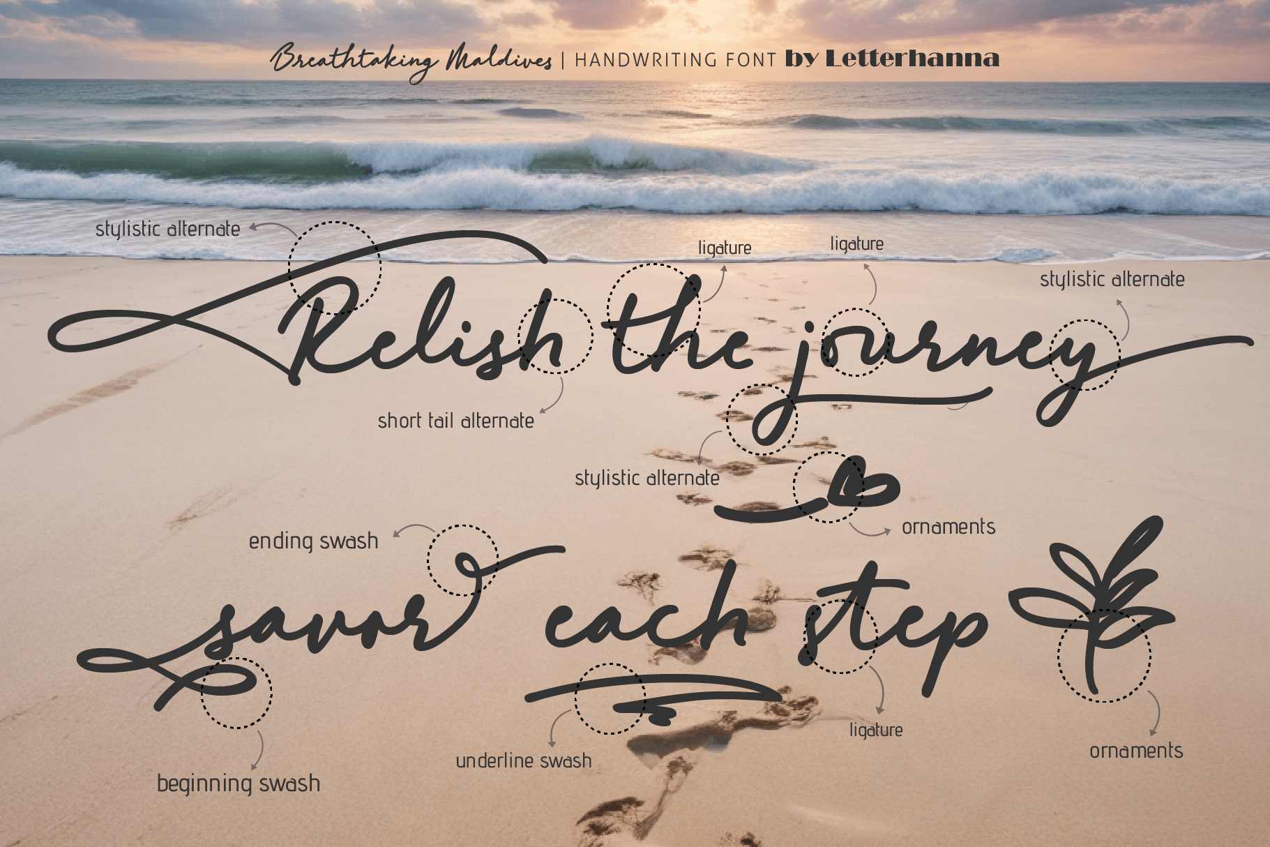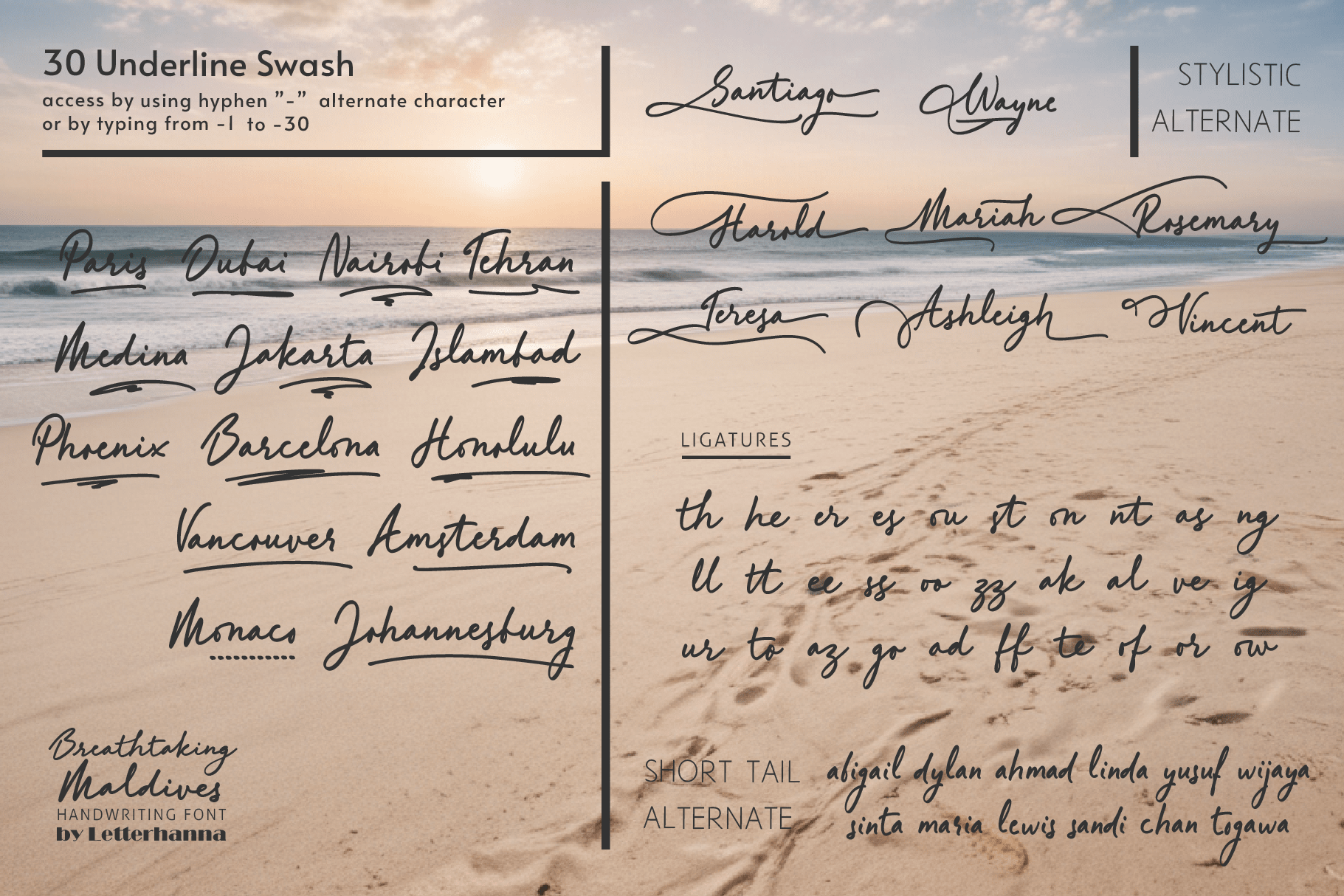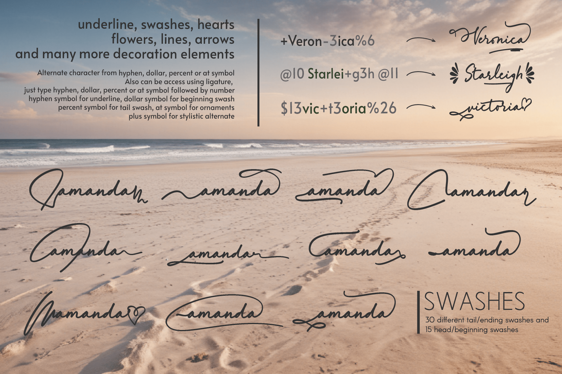 Gain easy access to all alternate glyphs, swashes, ornaments, and underlines by simply using ligatures. You can try them out yourself in the font preview tool on our website, letterhanna.com.