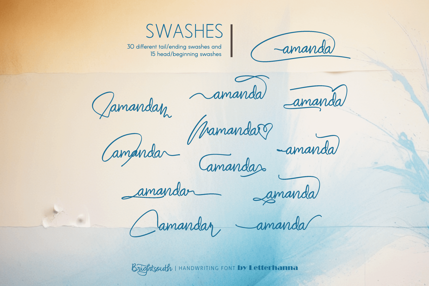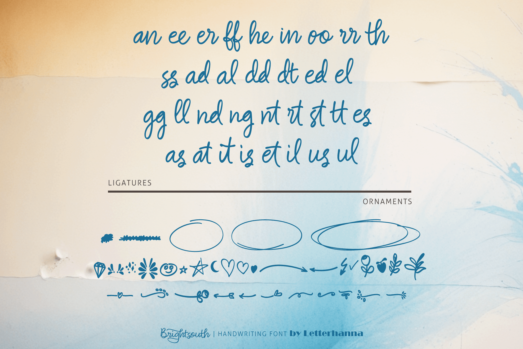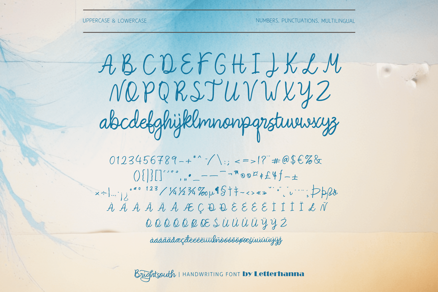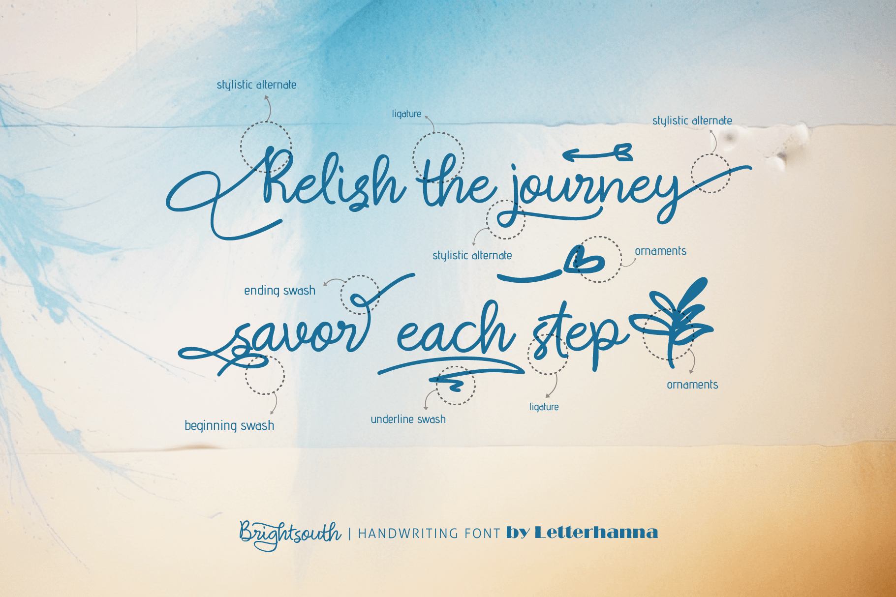 Introducing Brightsouth, a bold and dazzling script font ready to light up your designs! Brightsouth isn’t your average handwriting font. It bursts with personality, offering a treasure trove of stylistic alternates, swashes, and ligatures.