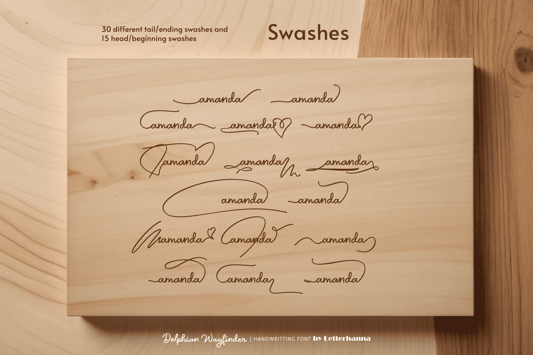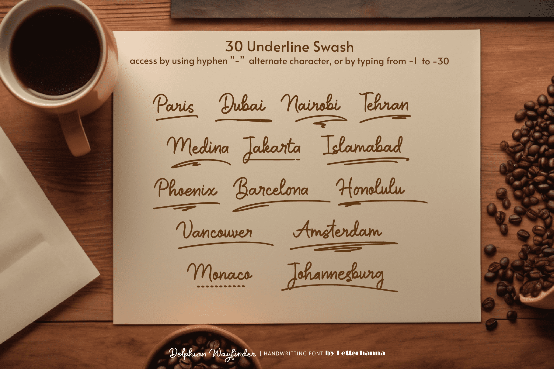 Gain easy access to all alternate glyphs, swashes, ornaments, and underlines by simply using ligatures. You can try them out yourself in the font preview tool on our website, letterhanna.com.