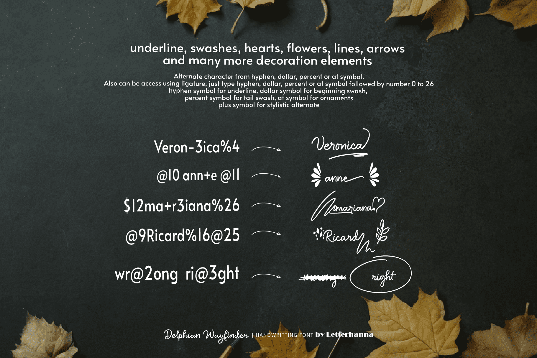 PUA Encoding for Ease of Use. The Delphian Wayfinder Font is also PUA encoded, which means you can access all the glyphs and swashes with ease!