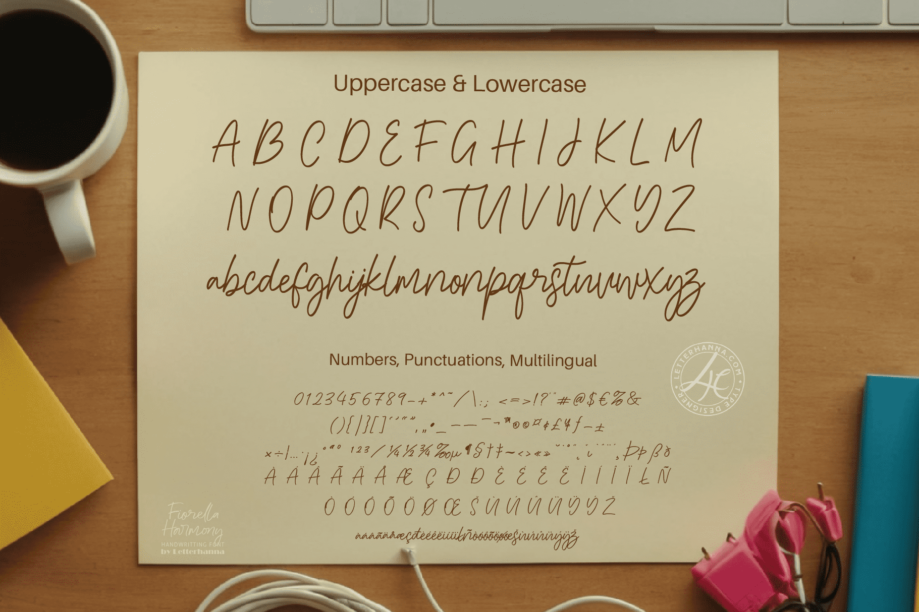 Indulge your creativity with Fiorella Harmony, a brand new handwritten script font designed to bring a touch of elegance and sophistication to your projects. Fiorella Harmony’s effortless flow and delicate curves make it perfect for adding a personal touch to wedding invitations, branding materials, and any design where a touch of handwritten charm is desired.