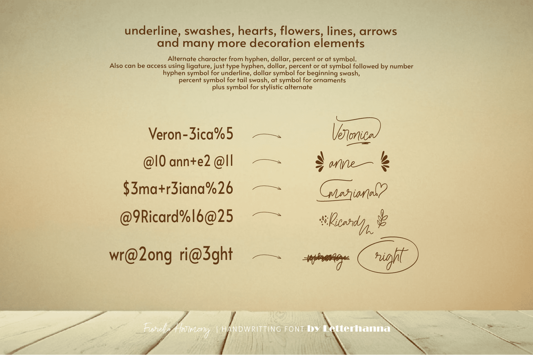 Gain easy access to all alternate glyphs, swashes, ornaments, and underlines by simply using ligatures. You can try them out yourself in the font preview tool on our website, letterhanna.com.