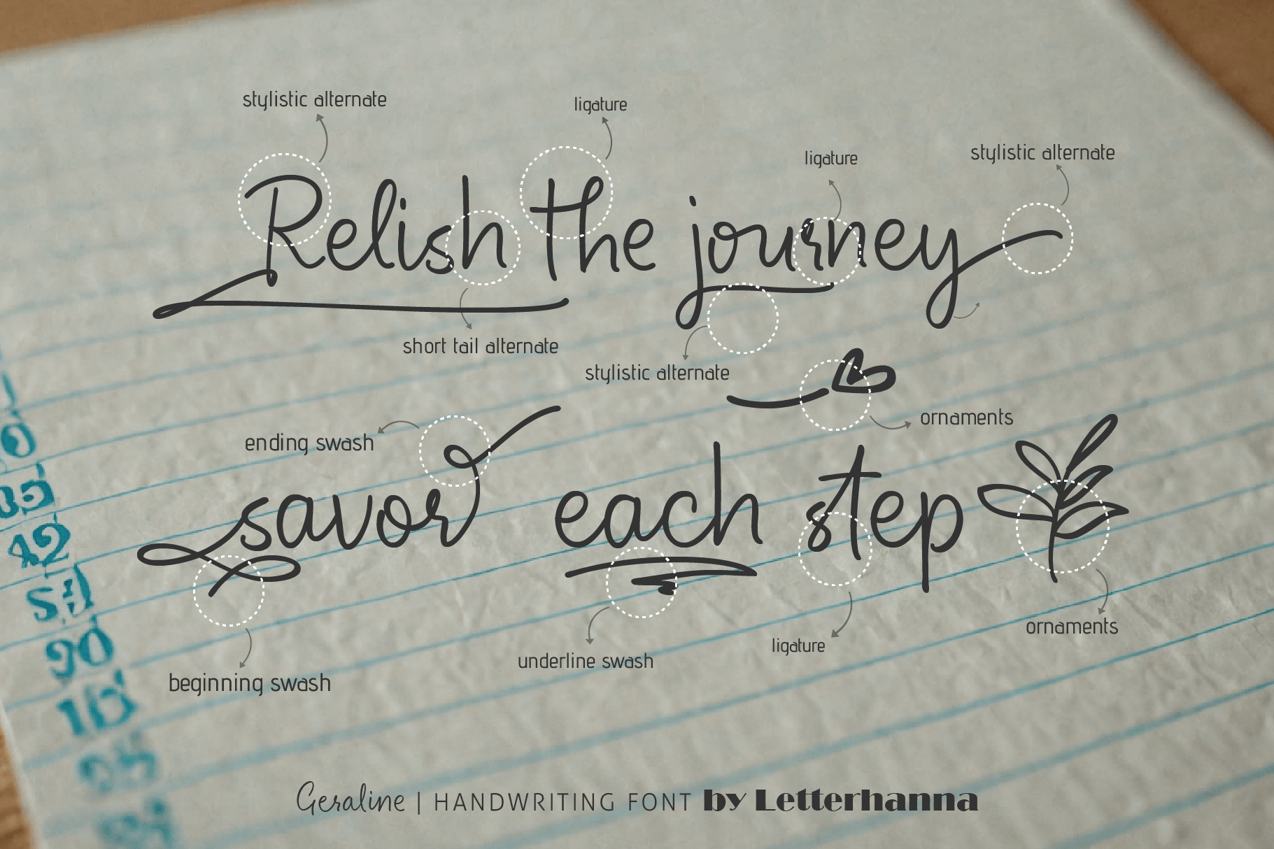 This font is packed with stylistic alternates, swashes, and ligatures, giving you endless creative possibilities to customize each letter with flair. The dynamic strokes and graceful letterforms ensure a seamless and artistic appearance, making every word feel truly handwritten. Geraline is a must-have for designers looking to bring a handwritten, personal, and effortlessly stylish aesthetic to their work.