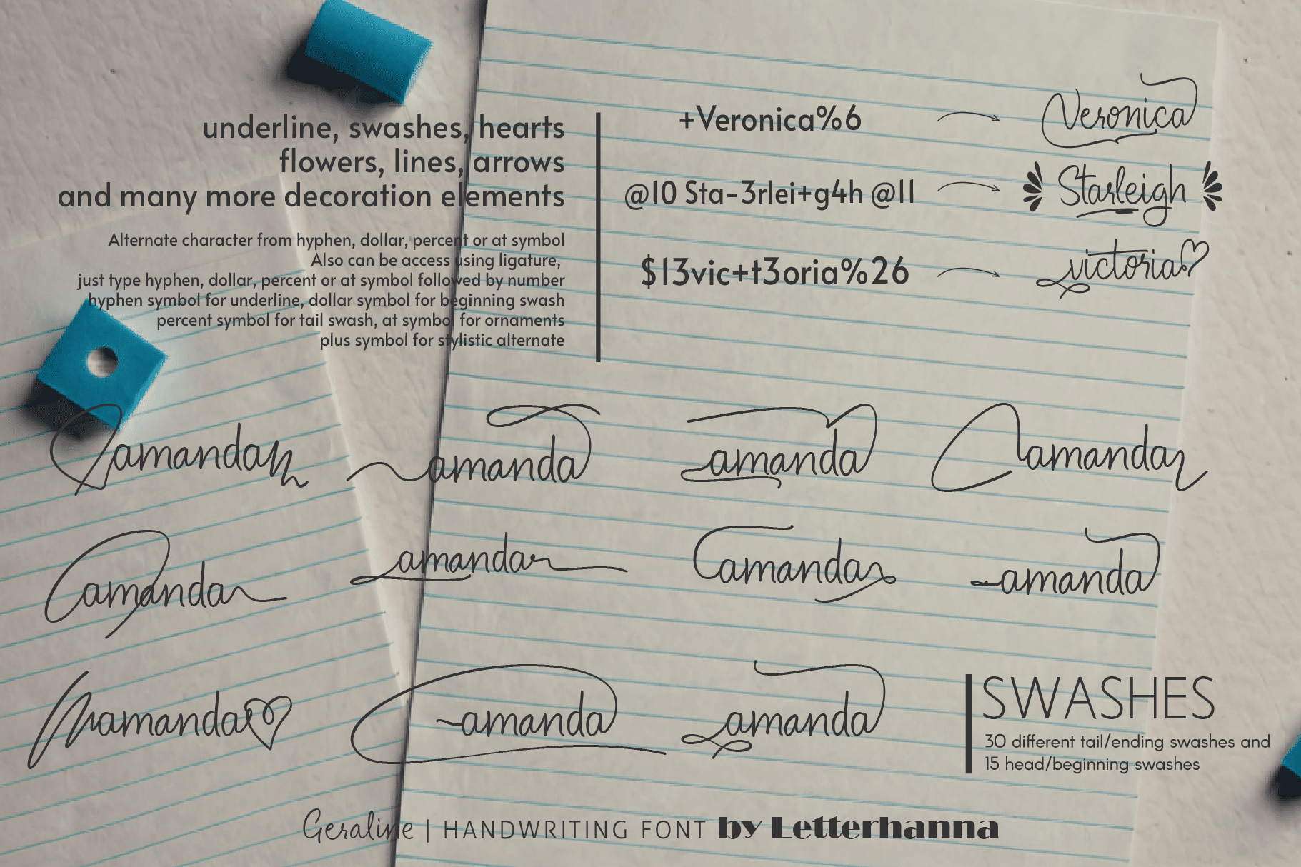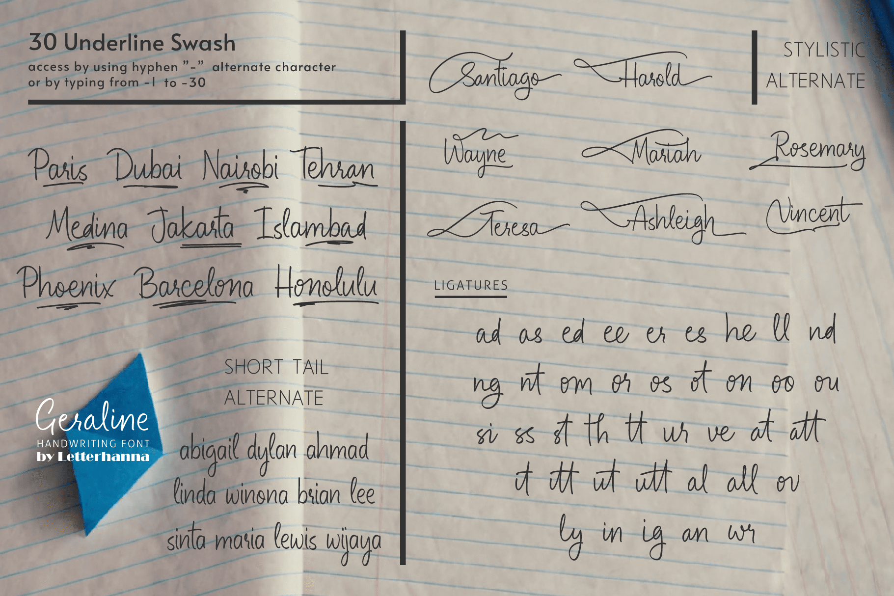 Gain easy access to all alternate glyphs, swashes, ornaments, and underlines by simply using ligatures. You can try them out yourself in the font preview tool on our website, letterhanna.com.