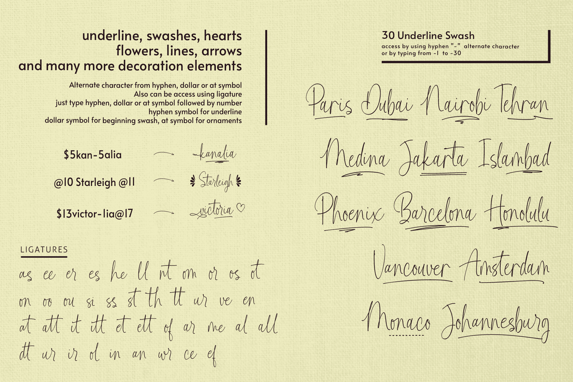 Gain easy access to all alternate glyphs, swashes, ornaments, and underlines by simply using ligatures. You can try them out yourself in the font preview tool on our website, letterhanna.com.