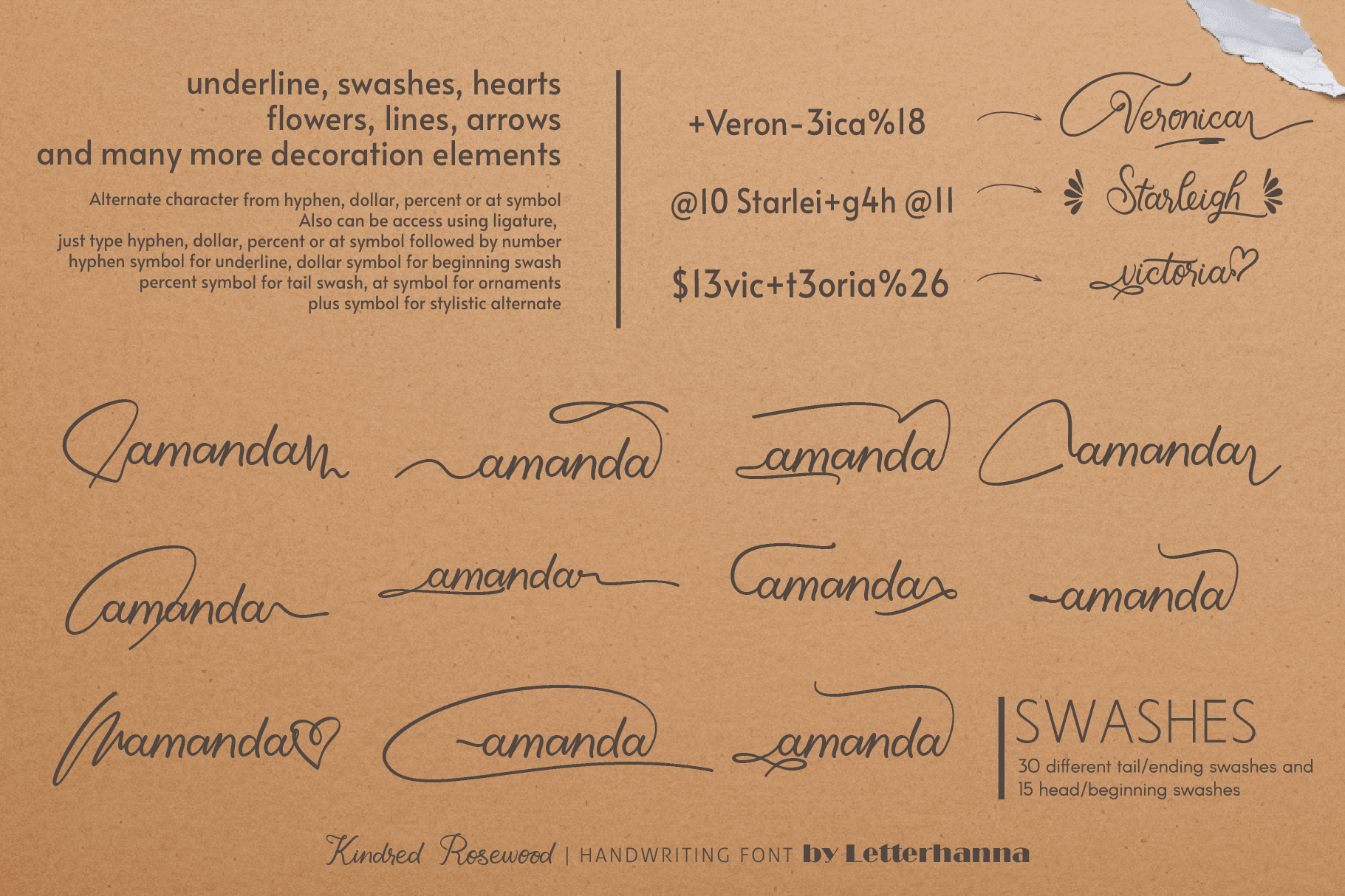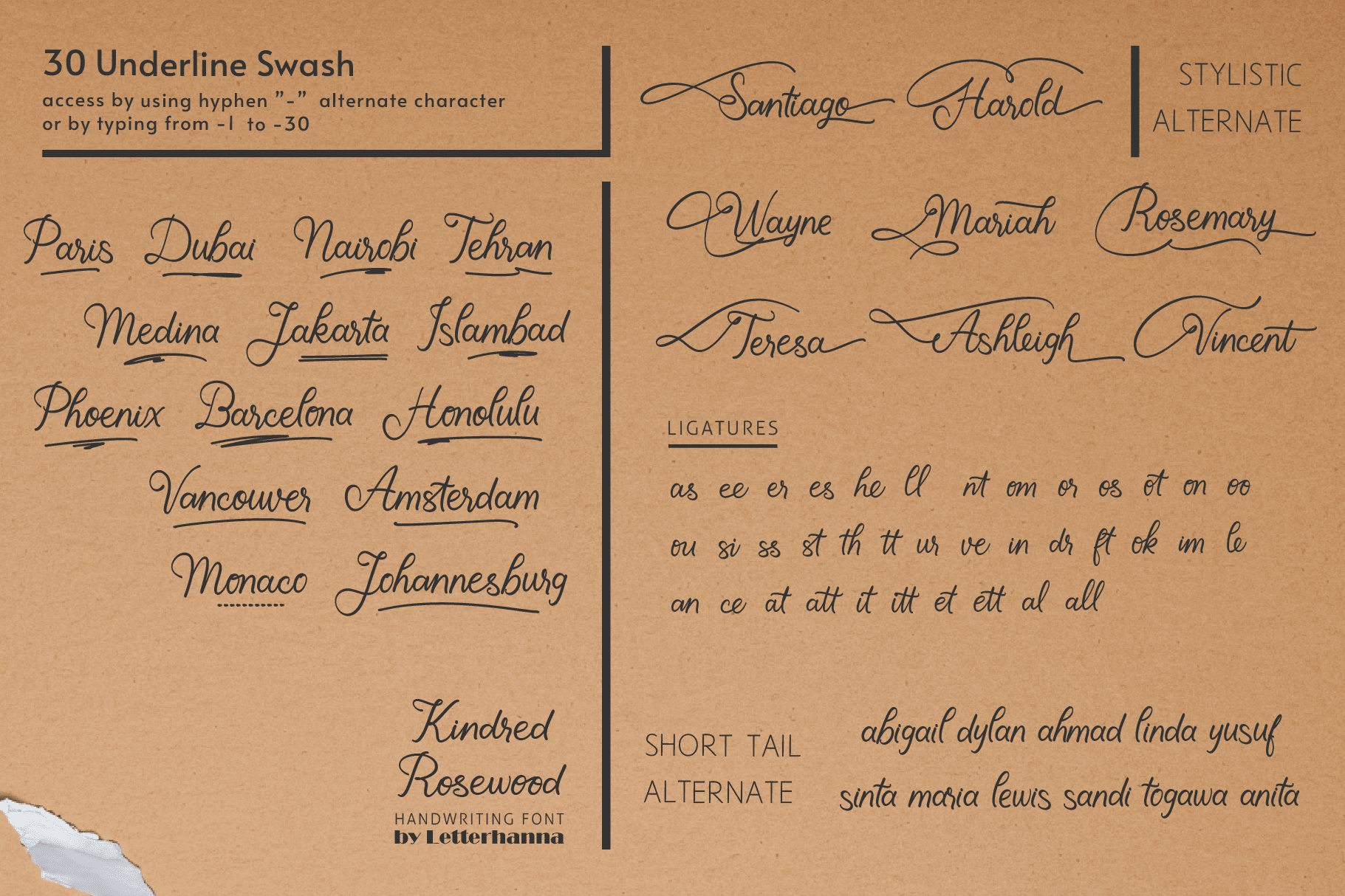 Gain easy access to all alternate glyphs, swashes, ornaments, and underlines by simply using ligatures. You can try them out yourself in the font preview tool on our website, letterhanna.com.