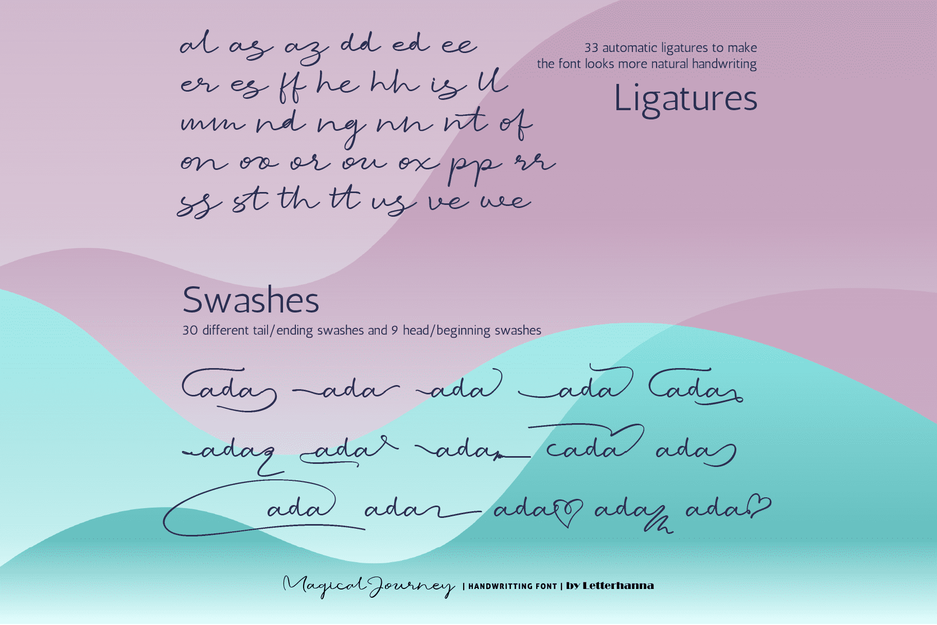 Magical Journey Font was created to look as close to a natural handwritten script as possible by including over 33 natural-looking opentype ligatures, Uppercase and lowercase Stylistic Alternate, a lot of head/beginning swashes and tail/ending swashes. There are also 30 underline swashes included and lot more ornaments, arrow, scribbles, etc.