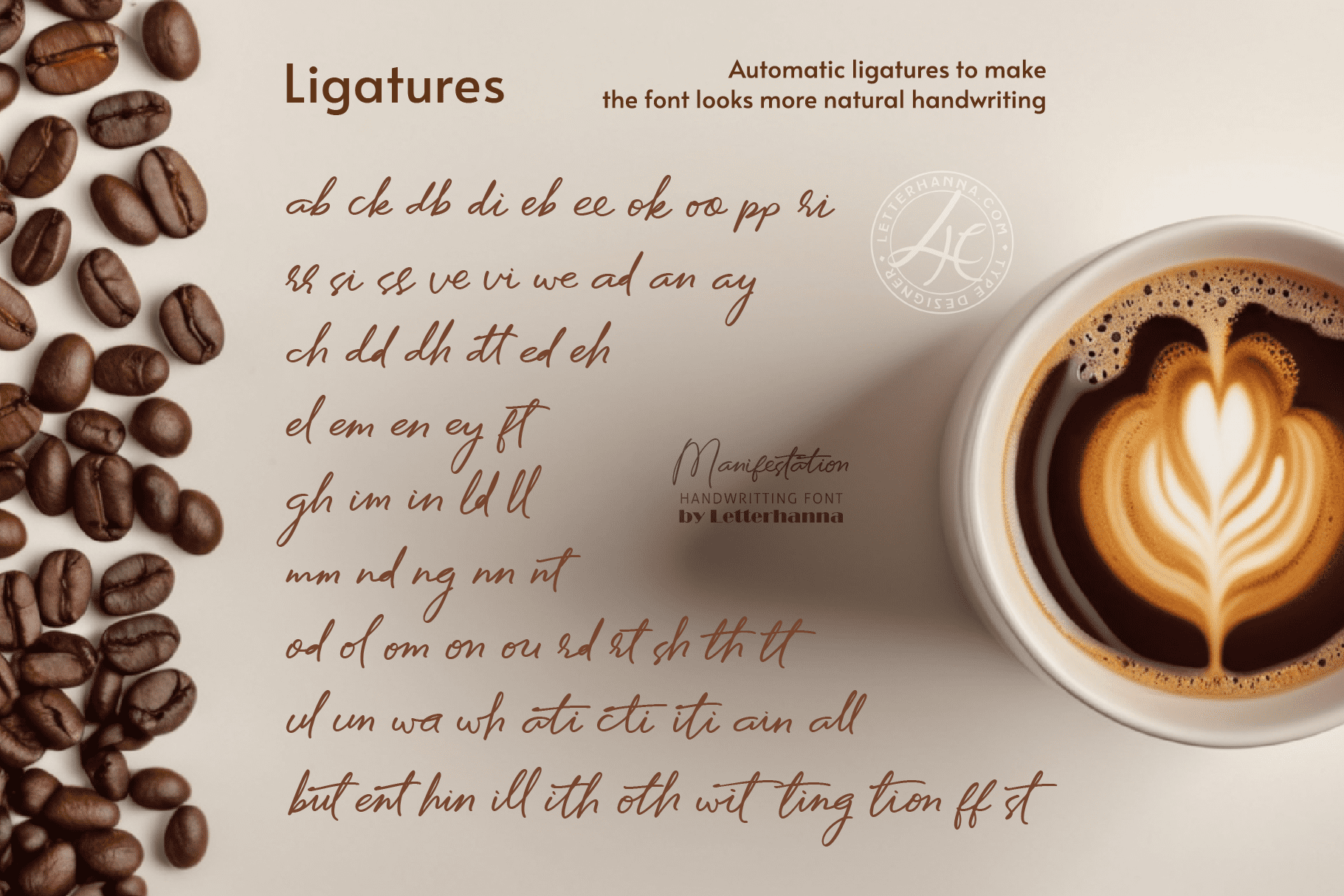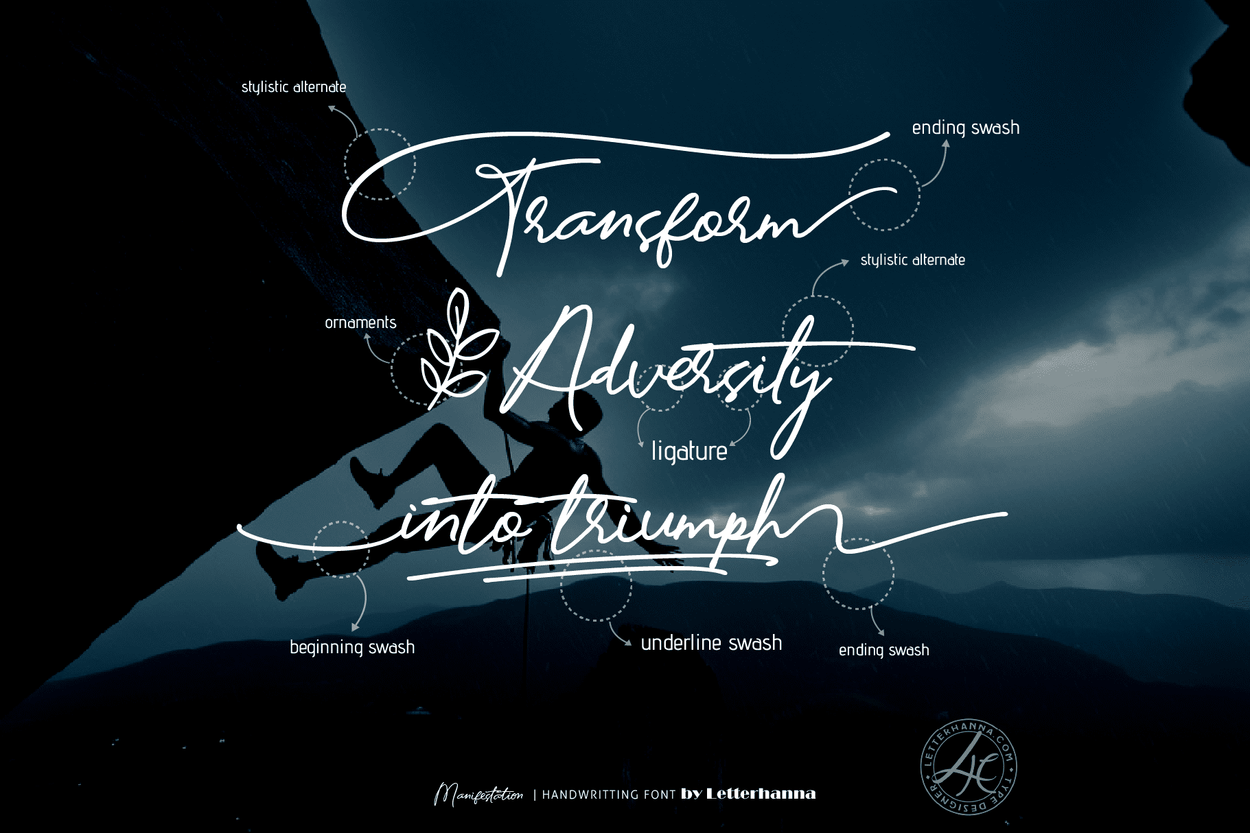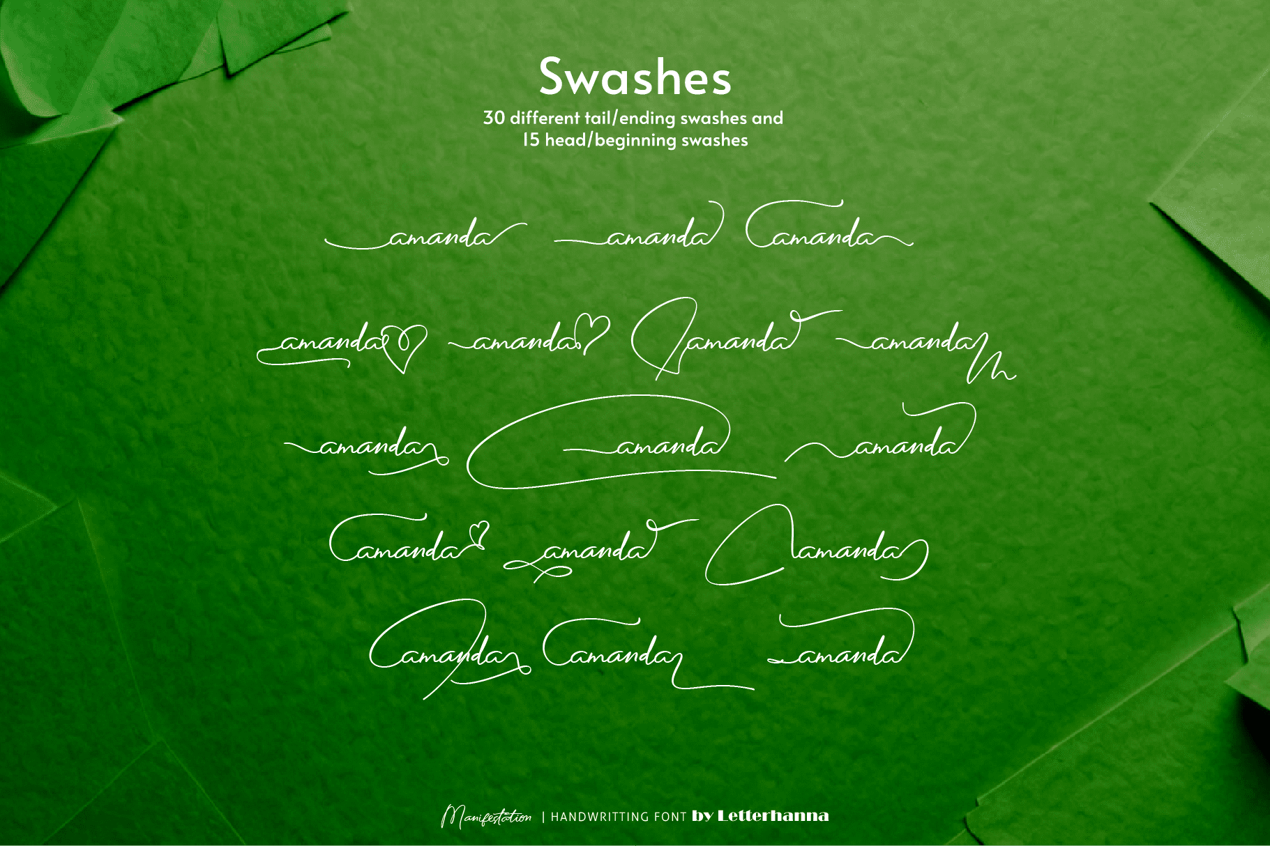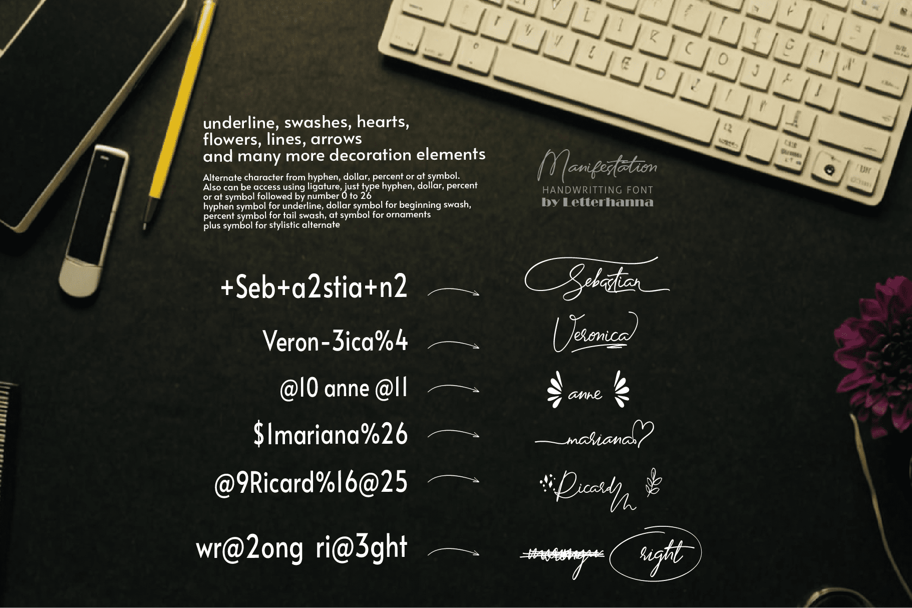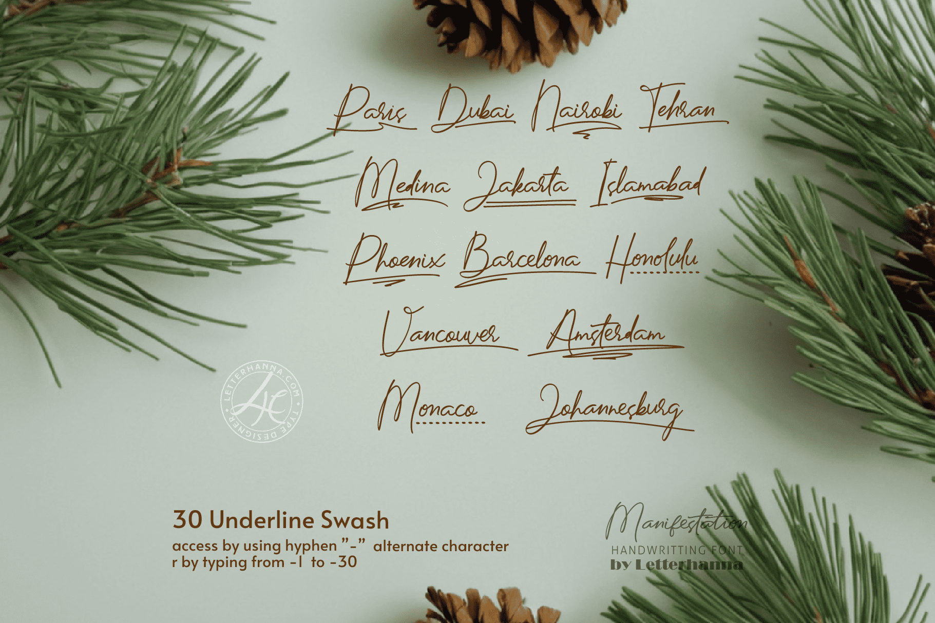Gain easy access to all alternate glyphs, swashes, ornaments, and underlines by simply using ligatures. You can try them out yourself in the font preview tool on our website, letterhanna.com.