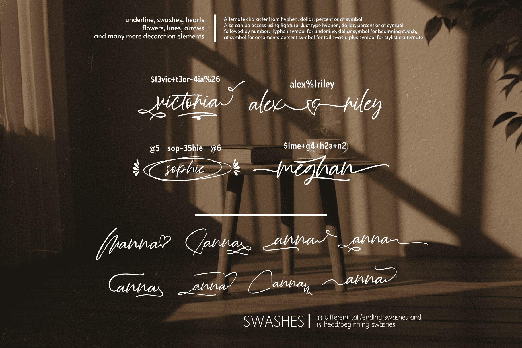 Gain easy access to all alternate glyphs, swashes, ornaments, and underlines by simply using ligatures. You can try them out yourself in the font preview tool on our website, letterhanna.com