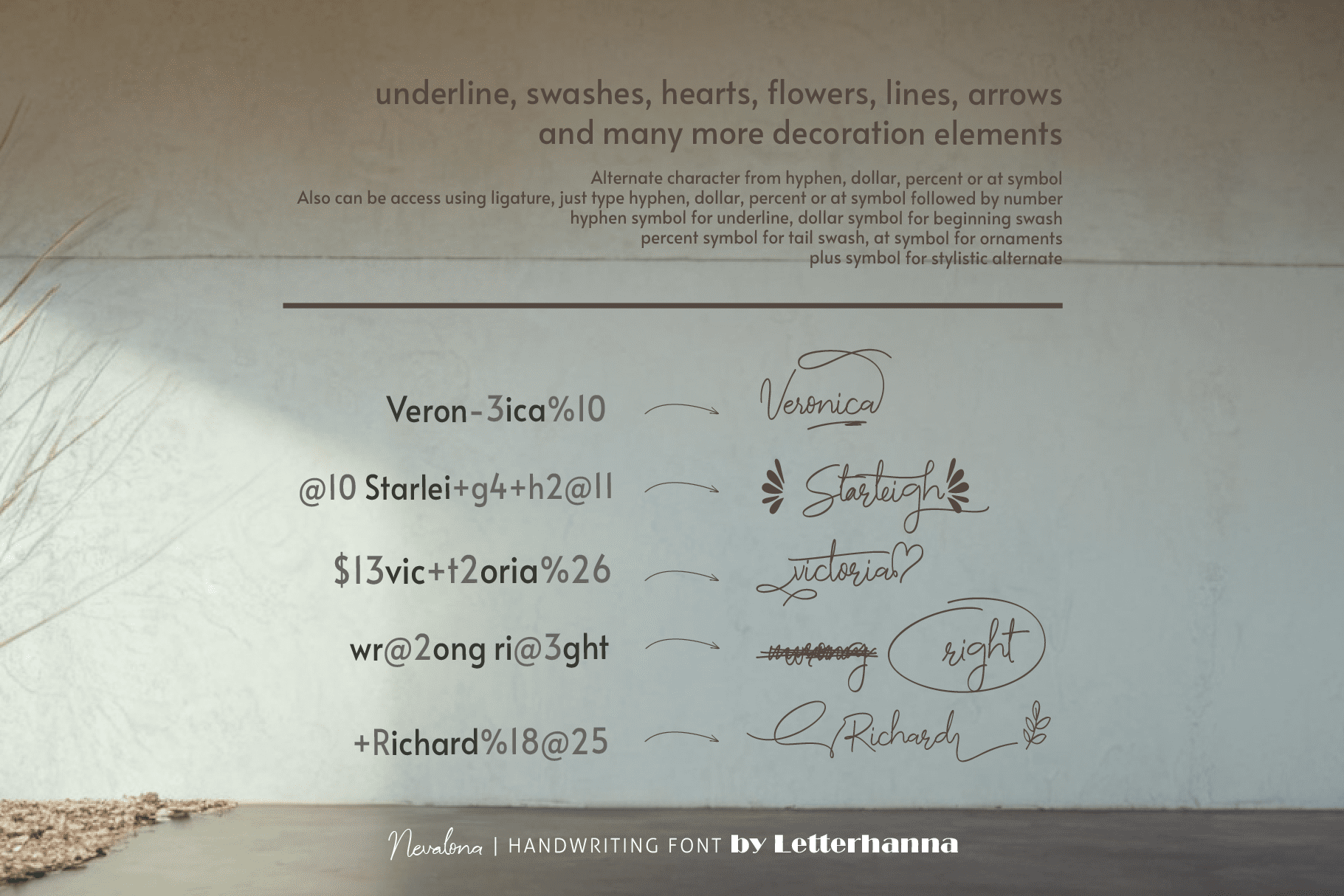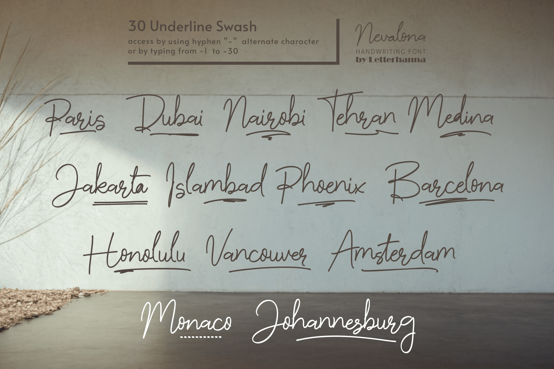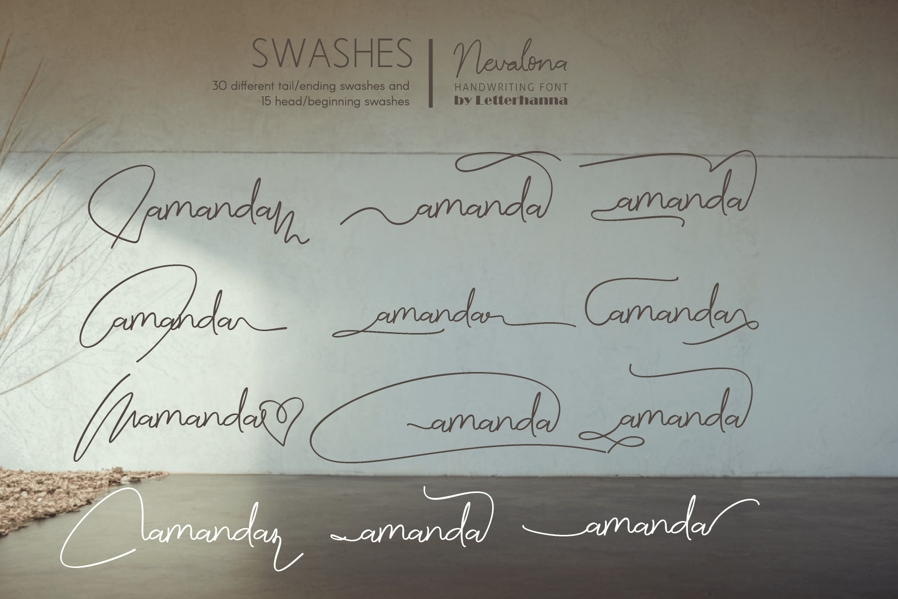 Gain easy access to all alternate glyphs, swashes, ornaments, and underlines by simply using ligatures. You can try them out yourself in the font preview tool on our website, letterhanna.com.