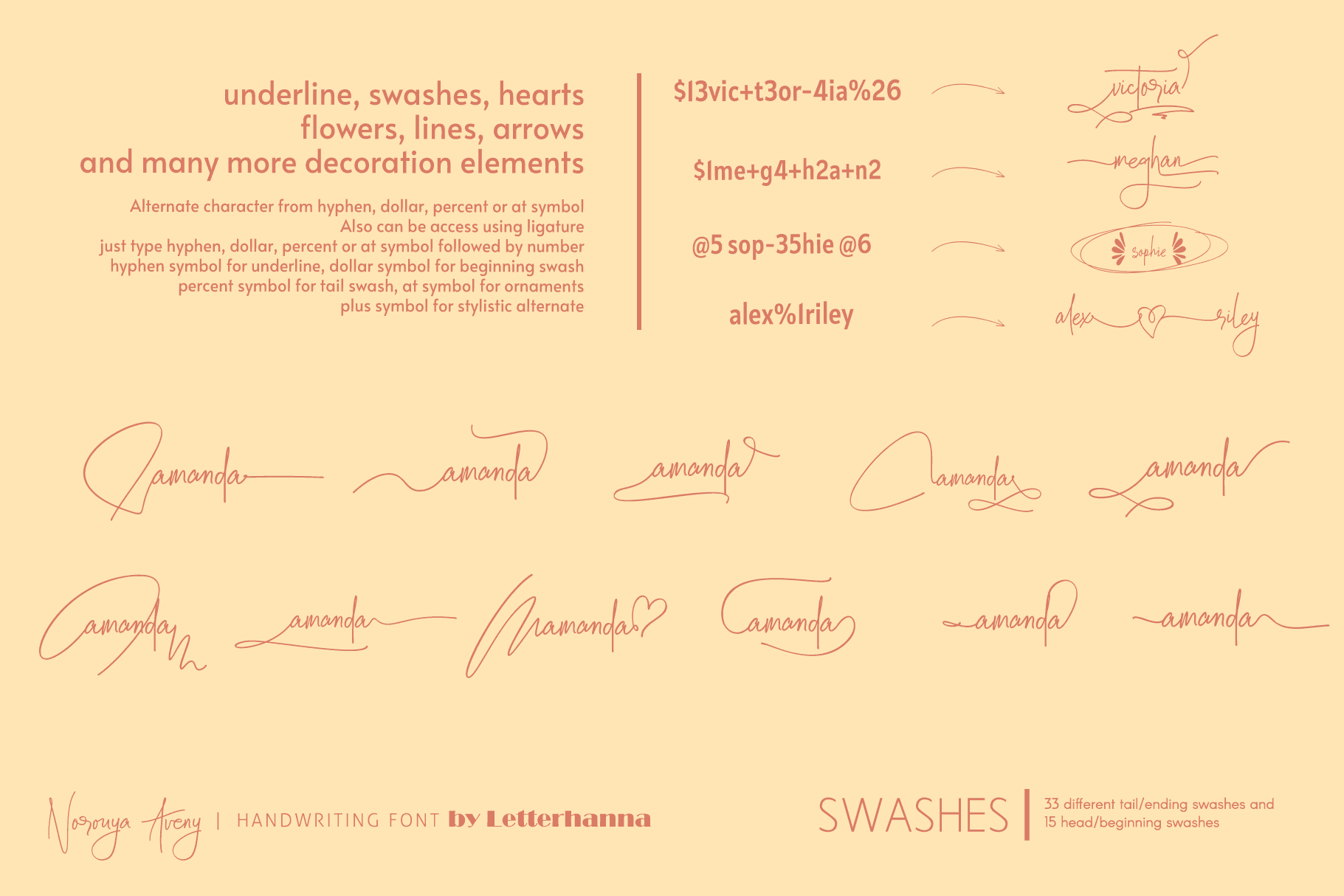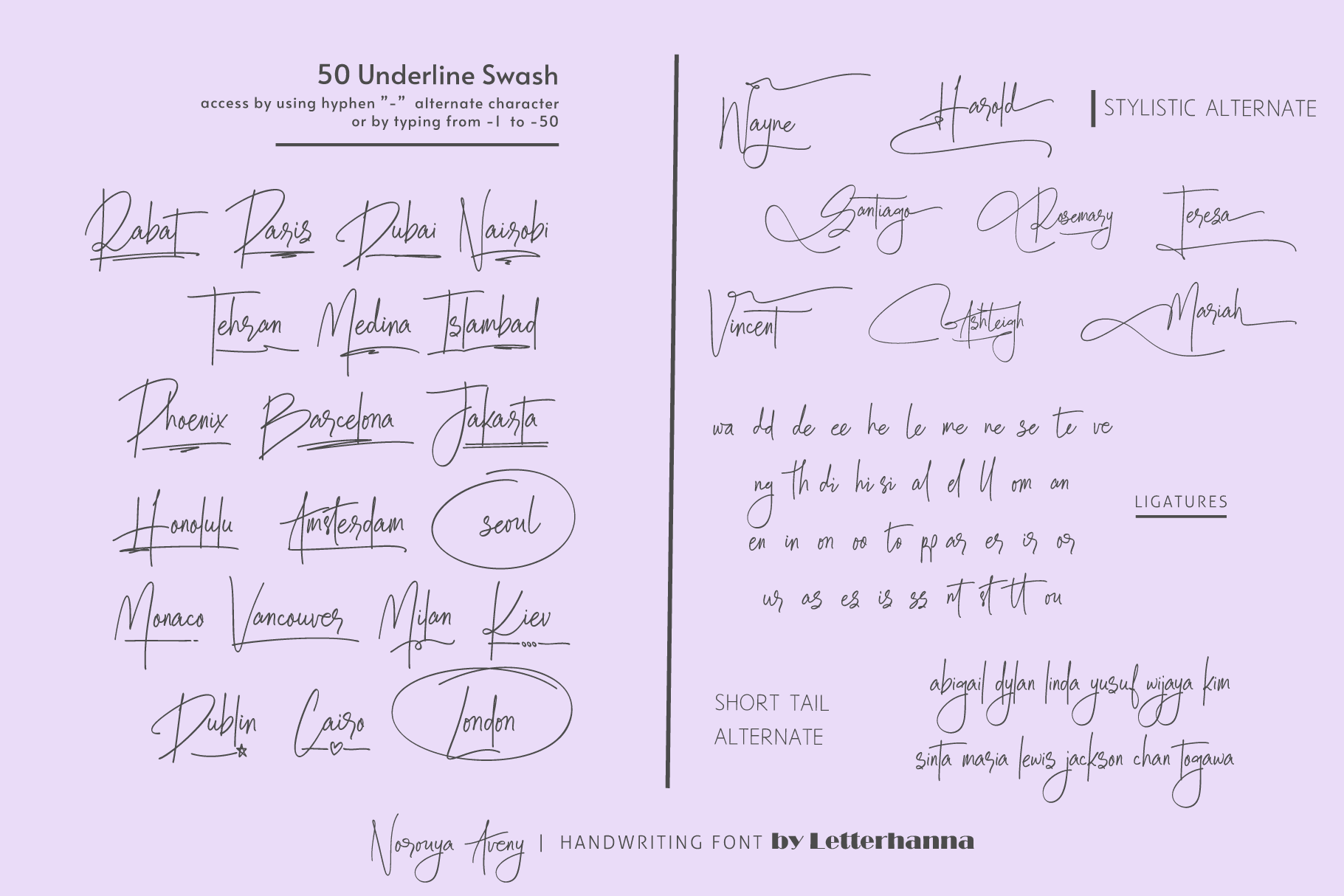 Gain easy access to all alternate glyphs, swashes, ornaments, and underlines by simply using ligatures. You can try them out yourself in the font preview tool on our website, letterhanna.com