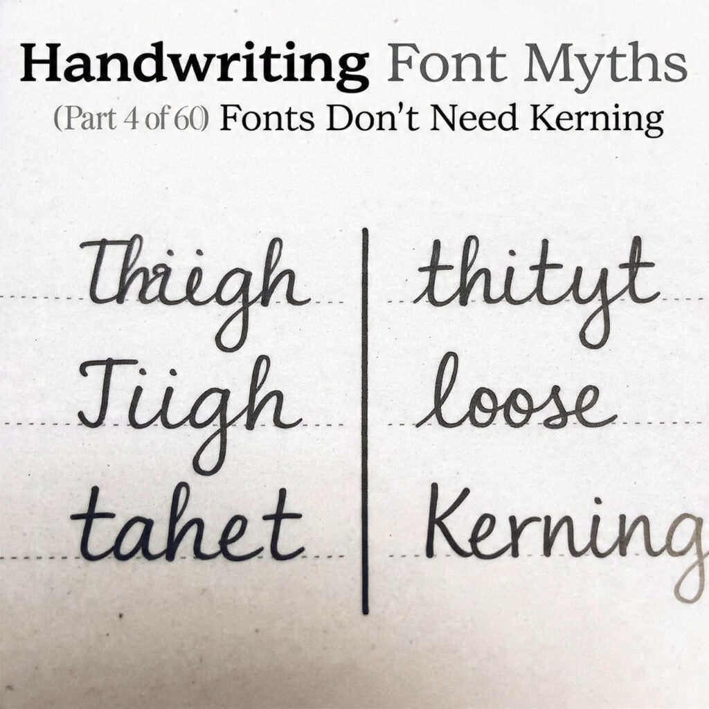 This myth is wrong in almost every particular, and it leads to fonts that look unfinished in ways that undermine whatever authenticity the designer was trying to achieve. Bad kerning in a handwriting font doesn’t read as natural variation. It reads as bad kerning. The eye is quite good at distinguishing between the two — even without the viewer being consciously aware of what they’re seeing.