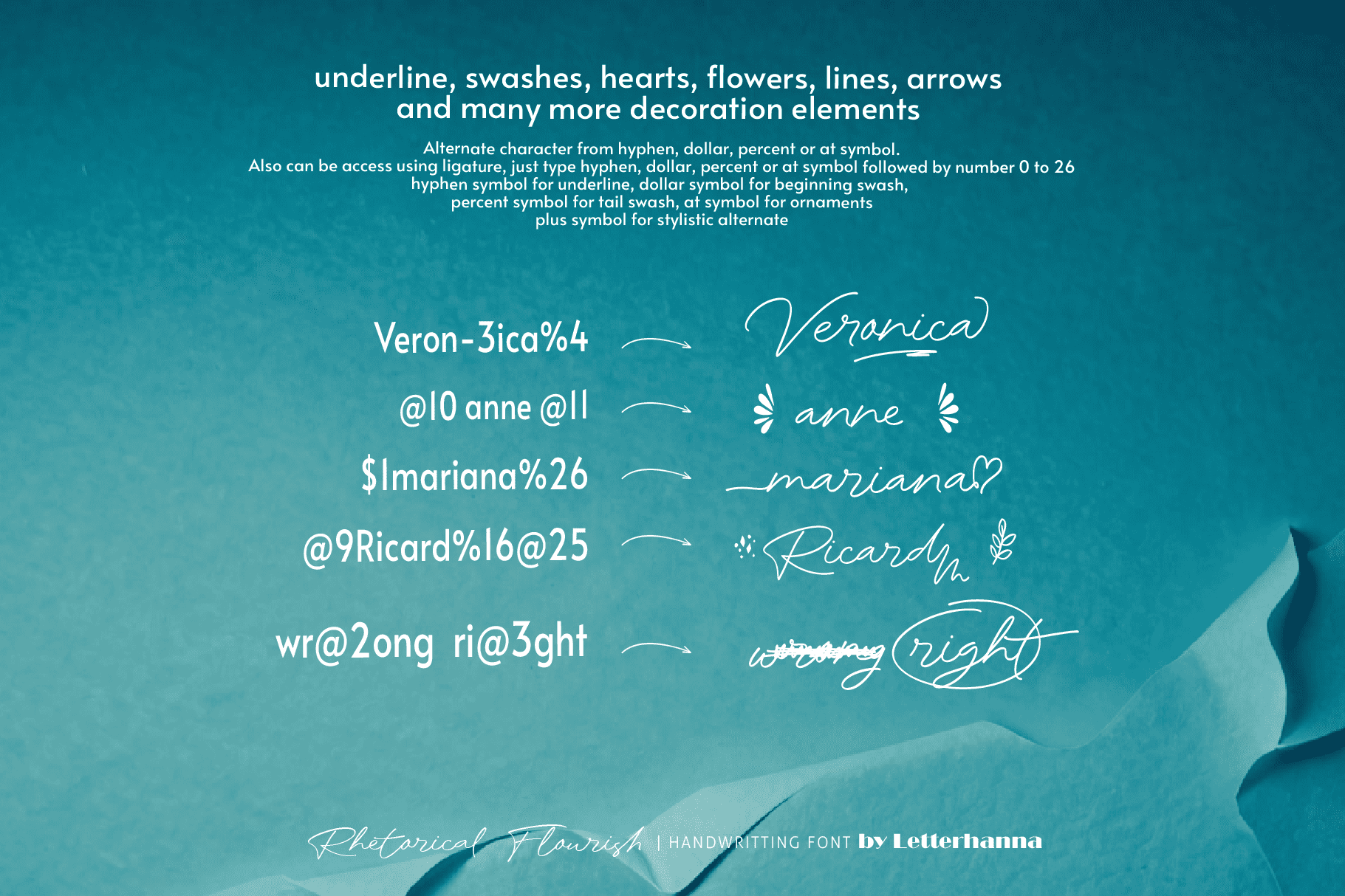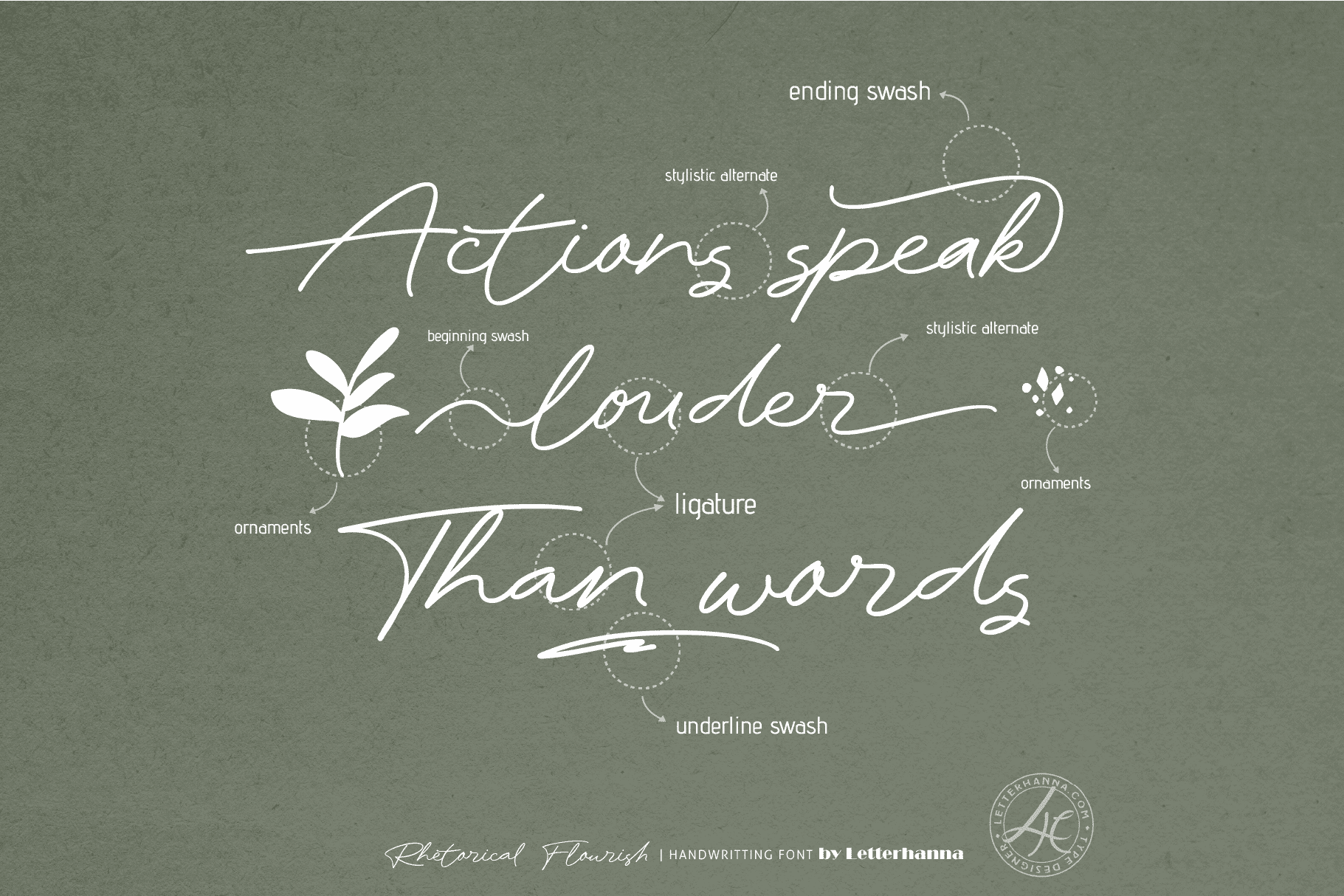 Gain easy access to all alternate glyphs, swashes, ornaments, and underlines by simply using ligatures. You can try them out yourself in the font preview tool on our website, letterhanna.com.