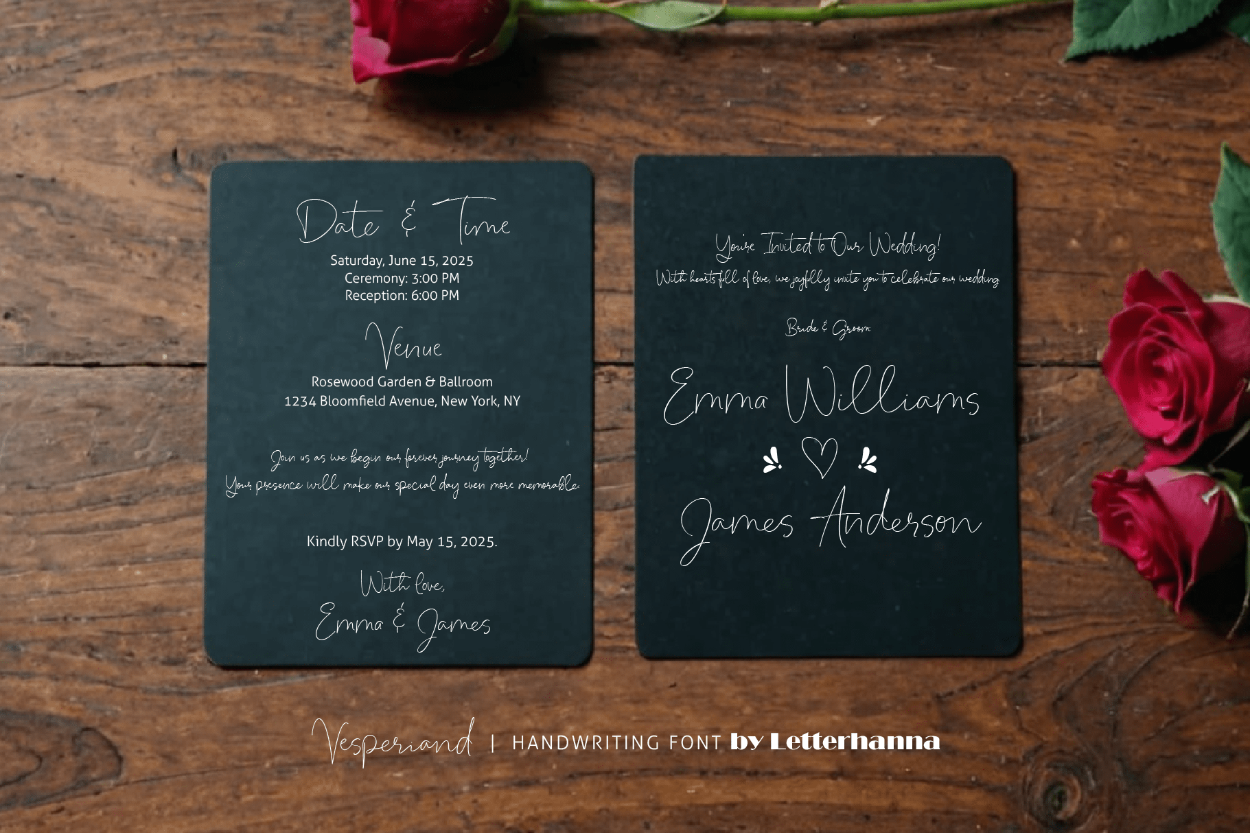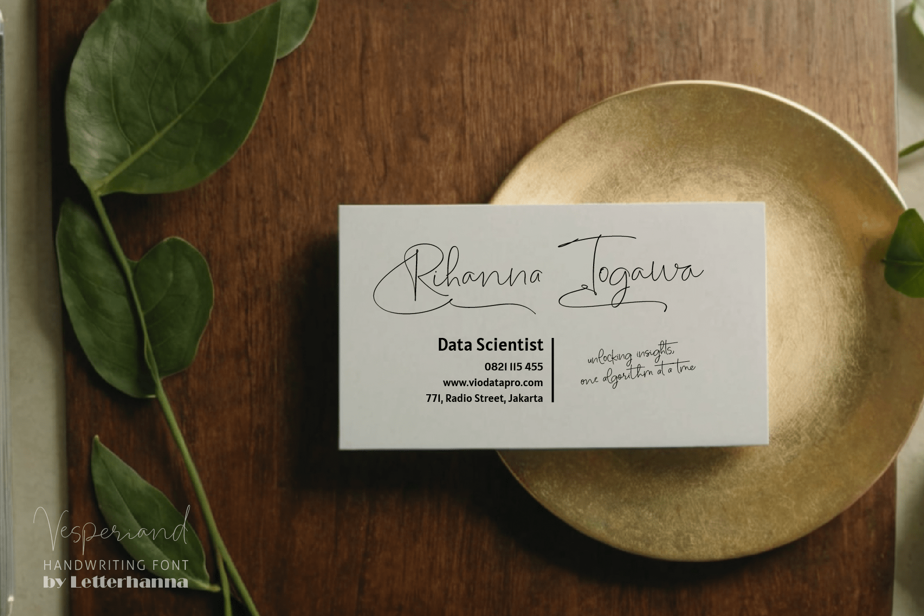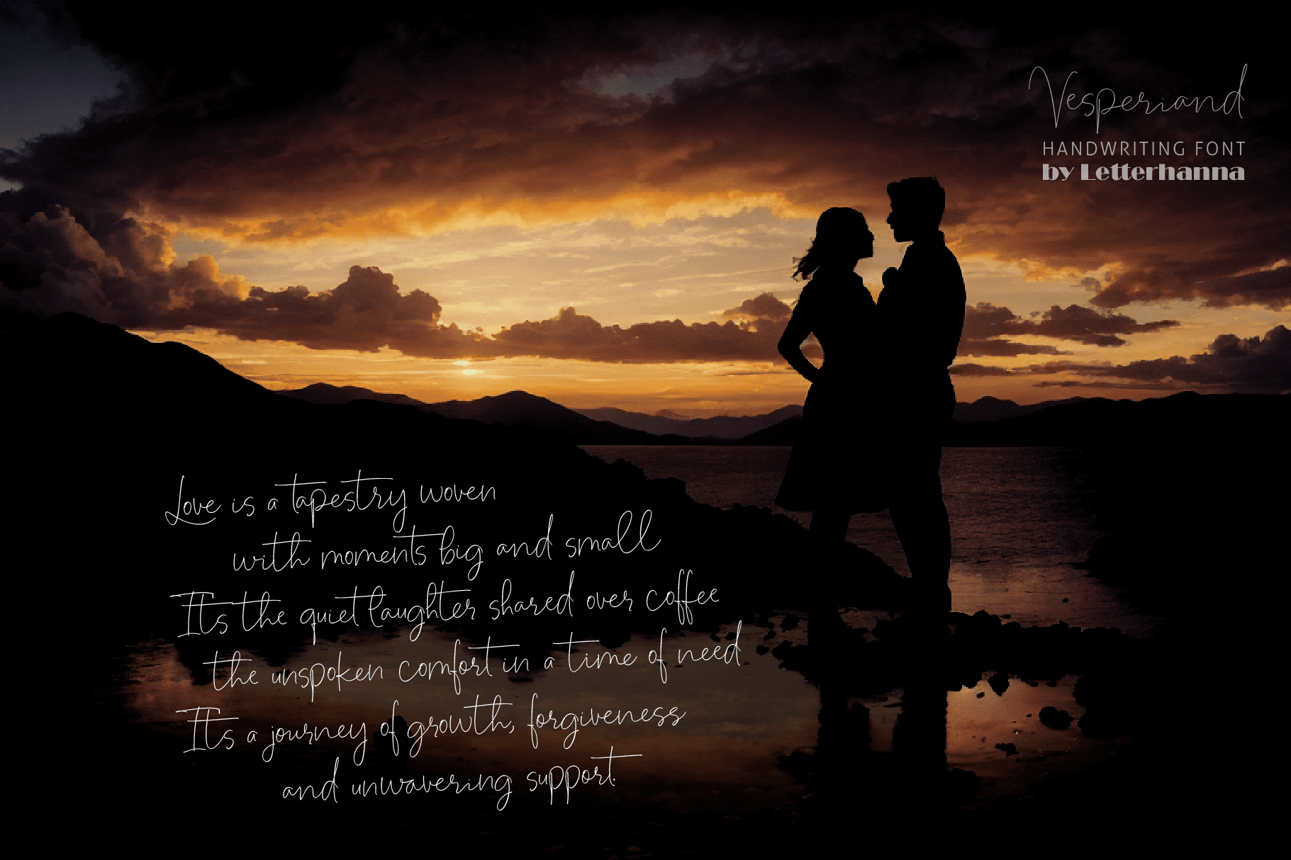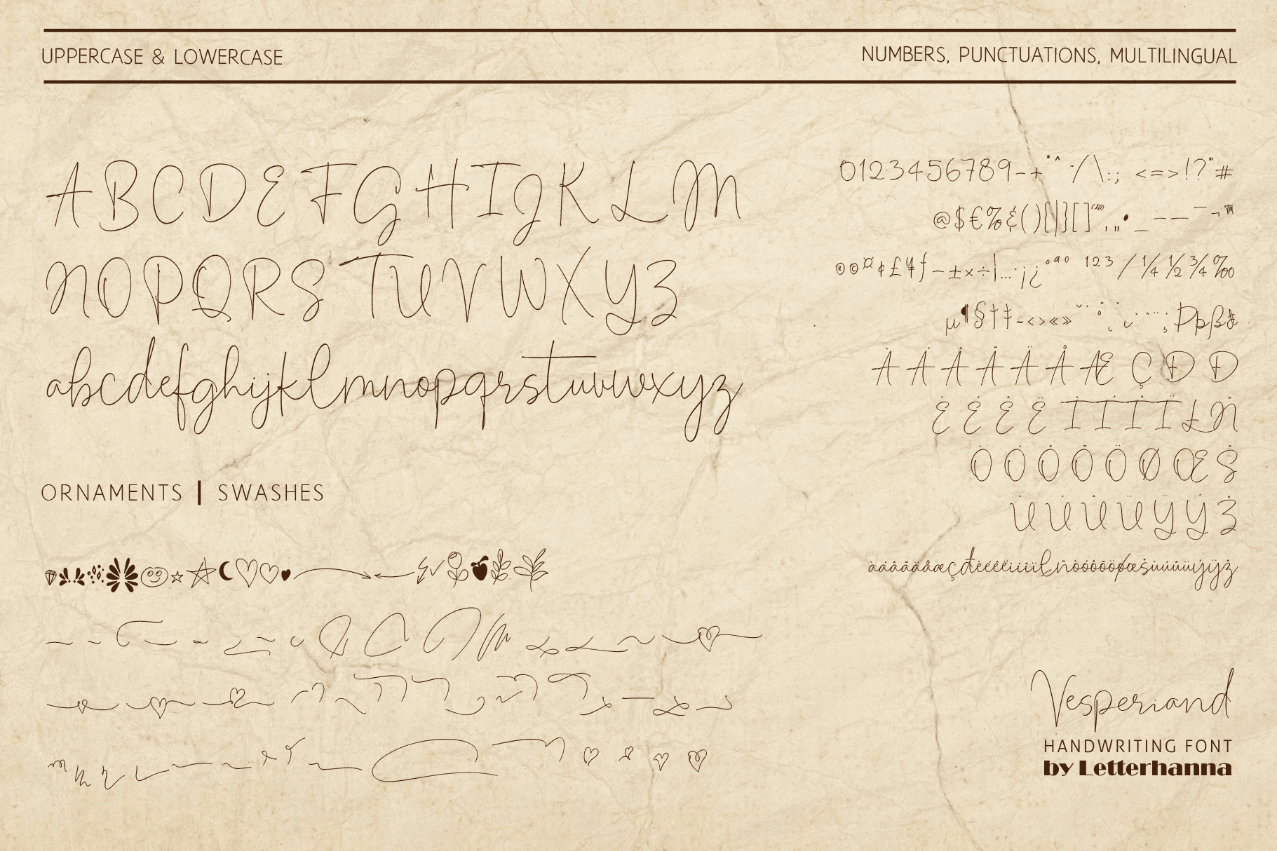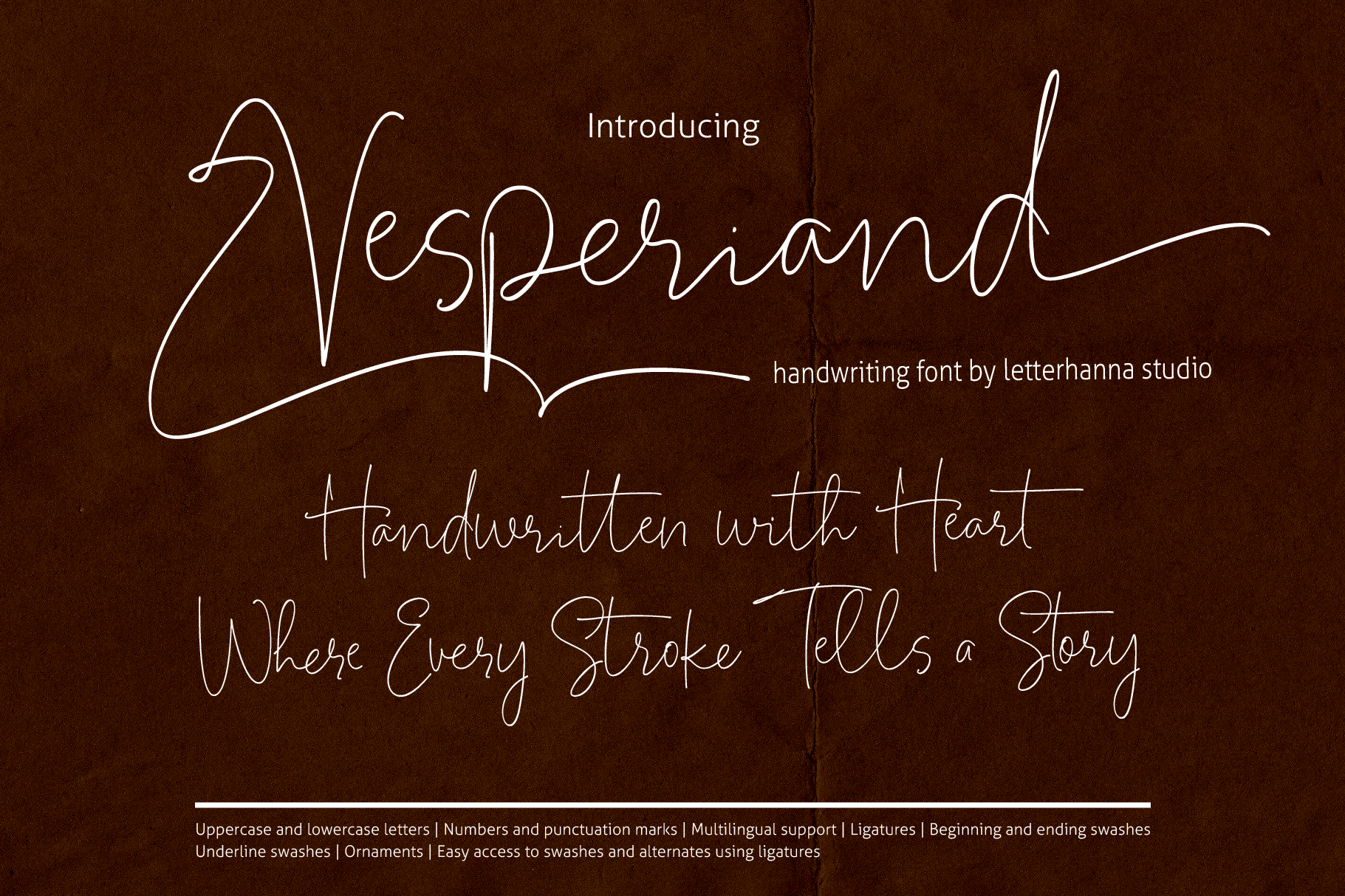 Introducing Vesperiand, a handwriting script font crafted for those who seek elegance with a personal touch. Designed with a rich collection of stylistic alternates, graceful swashes, and fluid ligatures, Vesperiand brings a natural yet sophisticated feel to your typography. Whether you’re working on branding, invitations, or creative projects, this font effortlessly adapts, adding charm and uniqueness to every word.