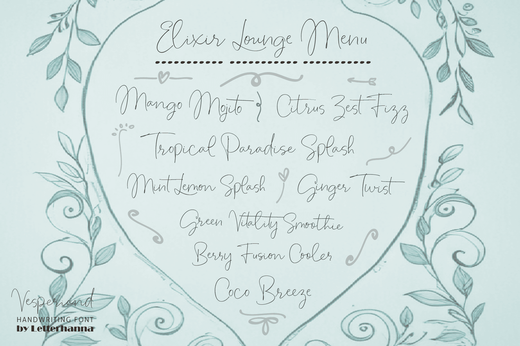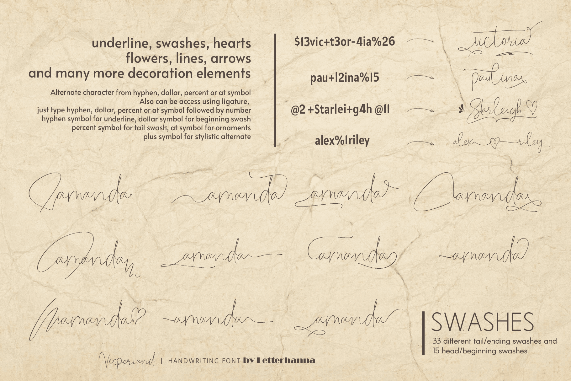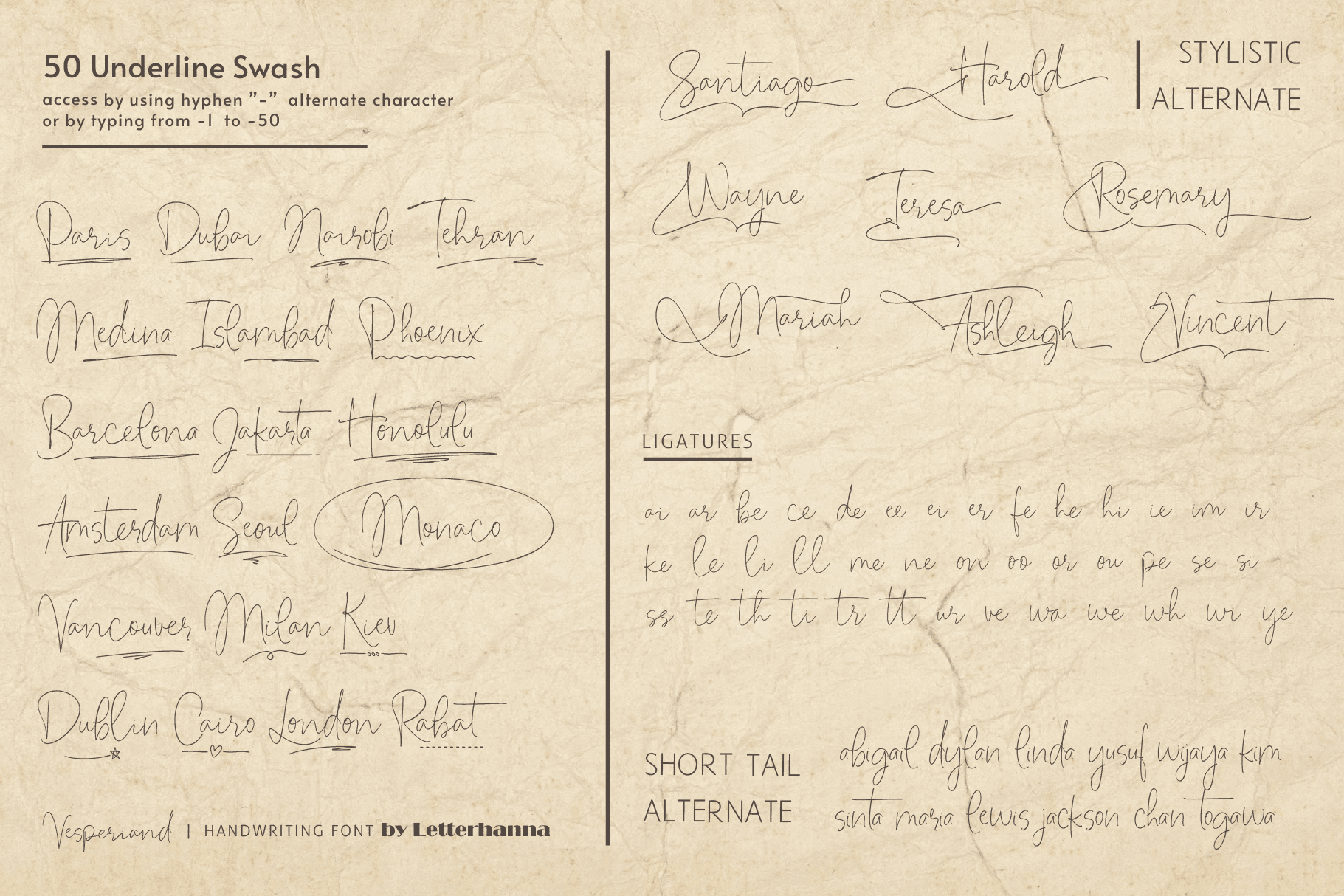 With Vesperiand, every letter flows seamlessly, creating a handcrafted aesthetic that feels both organic and refined. Its versatile design lets you mix and match swashes and alternates, giving you endless possibilities to personalize your text. Elevate your designs with the expressive beauty of Vesperiand—where artistry meets authenticity.